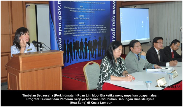 KUALA LUMPUR 6 Ogos------ Suruhanjaya Perkhidmatan Awam Malaysia (SPA) telah mengadakan Program Taklimat dan Pameran Kerjaya bersama Pertubuhan Gabungan Cina Malaysia (Hua Zong) di Kuala Lumpur, semalam (Ahad). Program yang diadakan selama sehari itu turut dihadiri oleh Ahli Suruhanjaya, Encik Boon Joh Lin, Timbalan Setiausaha (Perkhidmatan) Puan Lim Mooi Eia, Setiausaha Bahagian Perkhidmatan Cik Chan Hong Jin dan pegawai-pegawai SPA. Hadir sama Presiden Pertubuhan Gabungan Cina Malaysia (Hua Zong), YBhg. Tan Sri Pheng Yin Huah. Antara aktiviti-aktiviti yang diadakan ialah taklimat kerjaya oleh Puan Lim Irene, Penolong Setiausaha Bahagian Pengambilan Khas, Encik Boon Jon Lin, Ahli Suruhanjaya dan juga wakil daripada Jabatan Tenaga Kerja serta Jabatan Kastam. Program Taklimat dan Pameran Kerjaya yang dihadiri oleh lebih daripada 200 calon berketurunan Cina juga boleh mendaftar permohonan jawatan secara online, menyemak status terkini permohonan dan mendapatkan khidmat nasihat daripada Bahagian Pengambilan, Bahagian Pengambilan Khas dan Bahagian Peperiksaan. Program kerjaya yang bermula jam 10.00 pagi dan berakhir jam 3.00 petang itu juga telah mendapat liputan meluas daripada pihak Media Massa. ------MediaSPA
