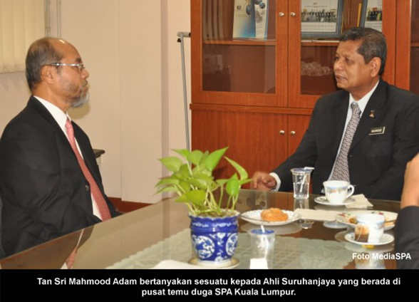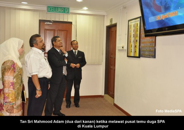 KUALA LUMPUR, 11 April ------ Pengerusi S.P.A, YBhg. Tan Sri Mahmood Adam telah membuat lawatan kerja ke Pusat Temu Duga S.P.A Jalan Cenderasari, Kuala Lumpur semalam. Lawatan selama 2 jam itu turut diiringi oleh Setiausaha Bahagian Pengambilan, Encik Abdullah Tahir dan Setiausaha Bahagian Pengurusan, Encik Mohd Nazri Dollah. Tan Sri Mahmood Adam juga turut melapangkan masa bertanya khabar kepada calon-calon yang hadir untuk sesi temu duga, melihat ruang bilik temu duga serta bilik rehat Ahli Suruhanjaya. Di akhir lawatan, Tan Sri Mahmood Adam meletakkan plak di Pusat Temu duga Cenderasari sebagai tanda kenangan. ----- MediaSPA