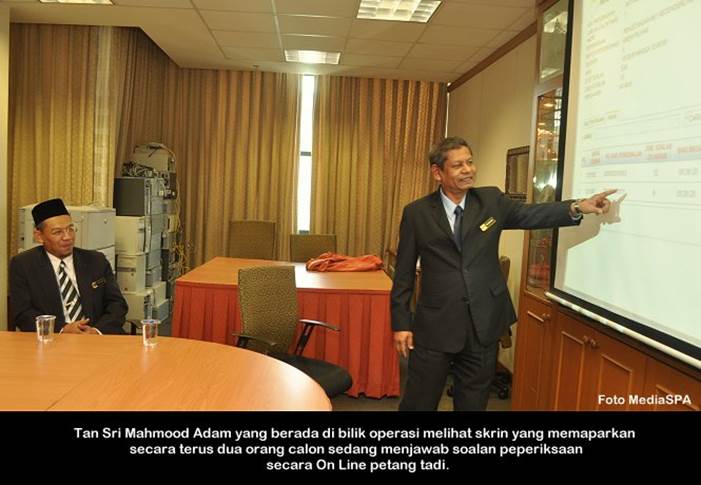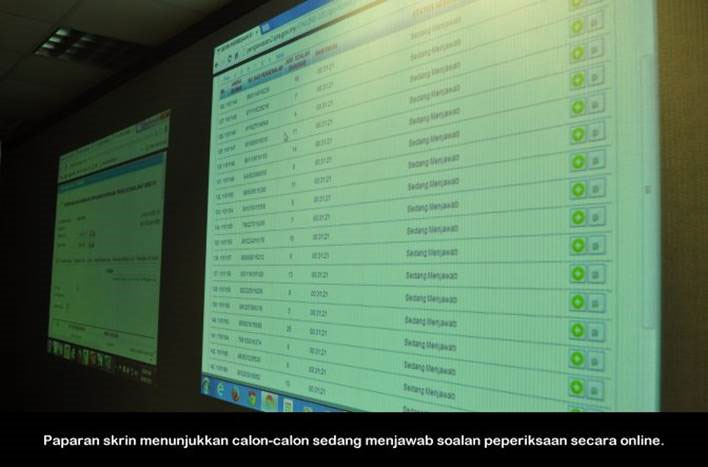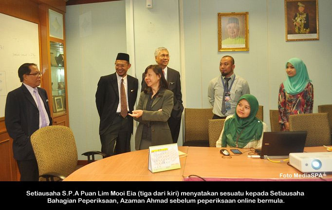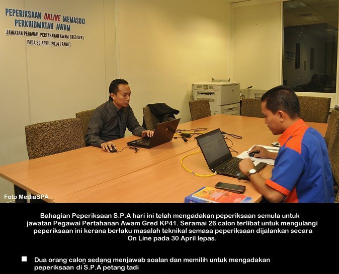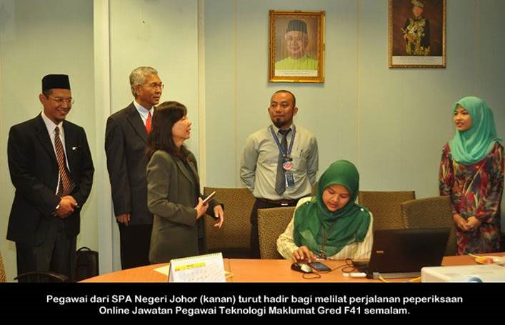 PUTRAJAYA, 16 Jun ------ Suruhanjaya Perkhidmatan Awam Malaysia (S.P.A) telah menjalankan urusan peperiksaan secara online bagi jawatan Pegawai Teknologi Maklumat Gred F41 Pengambilan SPA Johor, semalam. Seramai 231 atau 84.3 peratus calon hadir dalam peperiksaan termasuk calon yang berada di Arab Saudi dan Singapura. Setiausaha S.P.A Puan Lim Mooi Eia turut hadir bagi melihat perjalanan peperiksaan. ------ MediaSPA