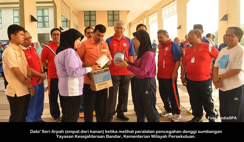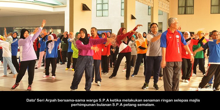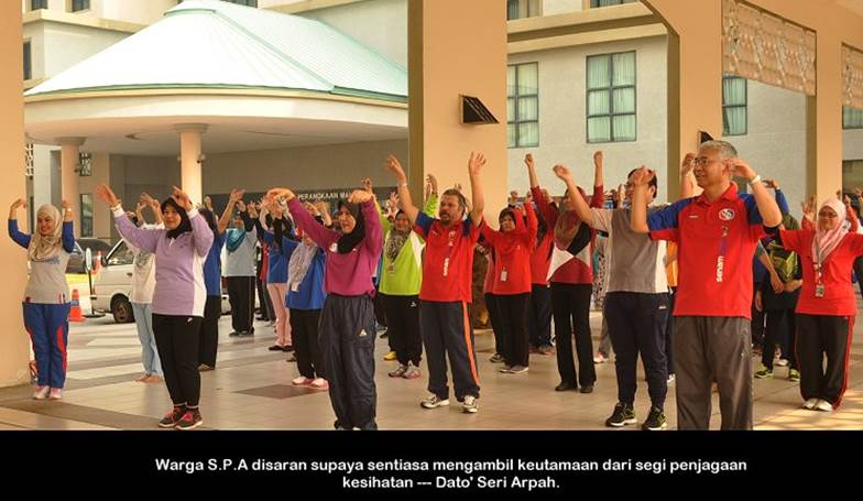 PUTRAJAYA 20 April ------ Pengerusi S.P.A, Dato’ Seri Arpah Abdul Razak berkata, penjawat awam seharusnya menjaga kesihatan dan mempunyai fizikal yang baik dan seterusnya dapat memberikan perkhidmatan yang cemerlang kepada perkhidmatan awam. Beliau berkata demikian pada majlis perhimpunan bulanan yang berkonsepkan secara santai dengan tema cergas dan sihat di Putrajaya petang semalam. Menurutnya lagi, S.P.A kini telah mengambil langkah iaitu pembaharuan bagi beberapa jawatan yang dikenalpasti melalui proses tapisan di Assessment Centre dan mereka akan diuji tahap kecergasan fizikal melalui ujian UKJK, BMI yang akan menentukan sama ada mereka layak ke peringkat seterusnya iaitu temu duga. Terdahulu, satu majlis ringkas penyampaian kit perlindungan lengkap denggi telah disampaikan oleh Dato’ Mustapha Ahmad S.Marican daripada Yayasan Kesejahteraan Bandar, Kementerian Wilayah Persekutuan untuk diagihkan kepada warga S.P.A. ------ MediaSPA