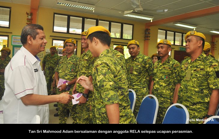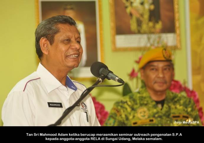 MELAKA, 4 April ------ Pengerusi S.P.A Tan Sri Mahmood Adam telah merasmikan seminar outreach pengenalan S.P.A dan perkhidmatan awam bersama anggota-anggota RELA di Sungai Udang, Melaka semalam. Seminar yang dihadiri lebih 200 anggota itu turut dihadiri Ketua Pengarah RELA Tuan Haji Lukeman Saaid. Dalam ucapan perasmian Tan Sri Mahmood Adam berkata tidak menjadi kesalahan sekiranya anggota RELA yang hadir ke sesi temu duga oleh S.P.A memakai pakaian lengkap RELA dan ini menunjukkan kesetiaan dan disiplin anggota tersebut. Cadangan itu turut mendapat sokongan daripada anggota yang hadir. Tan Sri Mahmood seterusnya menjalani latihan menembak di lapang lasar pusat latihan RELA. ------MediaSPA