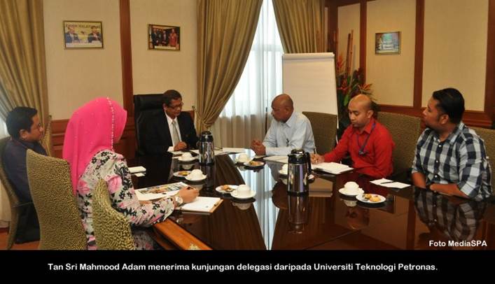 PUTRAJAYA, 8 April ------ Pengerusi S.P.A Tan Sri Mahmood Adam pagi ini telah menerima kunjungan daripada Universiti Teknologi Petronas (UTP). Delegasi seramai lima (5) orang diketuai oleh Vice Chancellor UTP Tuan Haji Mohamad Noor Rosli Baharom. Satu taklimat mengenai S.P.A telah disampaikan oleh Tan Sri Mahmood Adam. ------MediaSPA