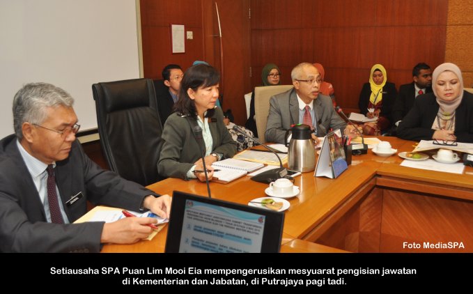 PUTRAJAYA, 28 April ------ Suruhanjaya Perkhidmatan Awam (S.P.A) hari ini telah mengadakan mesyuarat pengisian jawatan di Kementerian/Jabatan. Mesyuarat yang diadakan di Putrajaya di pengerusikan oleh Setiausaha S.P.A Puan Lim Mooi Eia. Hadir sama wakil pegawai dari Kementerian/Jabatan. ------MediaSPA