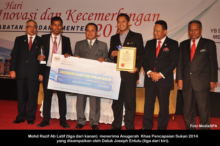 PUTRAJAYA, 29 Sept  ------ Mohd Razif Ab Latif dari Suruhanjaya Perkhidmatan Awam Malaysia (S.P.A) telah menerima Anugerah Khas Pencapaian Sukan sempena Hari Inovasi dan Kecemerlangan Jabatan Perdana Menteri 2015. Anugerah disampaikan oleh Menteri di Jabatan Perdana Menteri (JPM) Datuk Joseph Entulu Anak Belaun di Pusat Konvensyen Antarabangsa Putrajaya(PICC), Putrajaya semalam. Majlis turut dihadiri Ketua Pengarah Perkhidmatan Awam (KPPA) Tan Sri Mohamad Zabidi Zainal. Turut hadir Pengerusi S.P.A Dato’ Seri Arpah Abdul Razak dan Setiausaha S.P.A, Dato’ Zainal Abidin Ahmad.  ------  MediaSPA