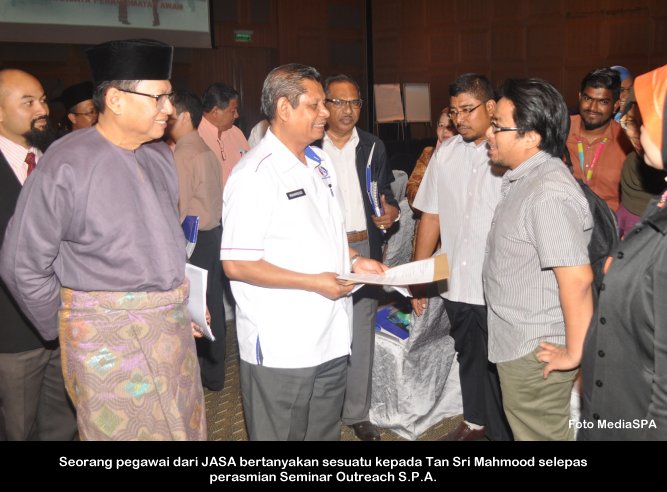 KUALA LUMPUR, 3 April ------ Pengerusi S.P.A Tan Sri Mahmood Adam hari ini telah merasmikan “Seminar S.P.A Outreach” dan seterusnya mengadakan sesi dialog bersama pegawai-pegawai dari Jabatan Hal Ehwal Khas (JASA) yang diadakan di Kuala Lumpur. Sesi dialog ini turut dihadiri Ketua Pengarah JASA Datuk Dr. Mohd Puad Zarkashi. Hadir sama Setiausaha S.P.A Puan Lim Mooi Eia dan satu sesi ceramah berkaitan dengan “Pengenalan S.P.A dan Perkhidmatan Awam” telah disampaikan oleh pegawai dari Bahagian Pengambilan. ------MediaSPA