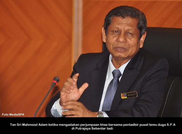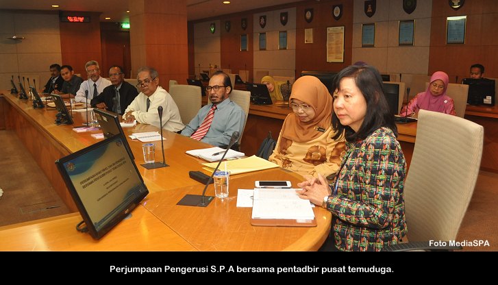 PUTRAJAYA, 15 April ------ Pengerusi S.P.A, Tan Sri Mahmood Adam sebentar tadi mengadakan perjumpaan dan mempengerusikan Mesyuarat bersama pentadbir pusat temu duga S.P.A. Antara lain perbincangan dalam mesyuarat ialah mengenai operasi pusat temu duga yang dibuka pada setiap hari bekerja bagi memudahkan pelanggan berurusan seperti pendaftaran borang online serta urusan berkaitan S.P.A. Kini terdapat 14 pusat temu duga S.P.A iaitu di Putrajaya, Kuala Lumpur, Kota Baharu, Kuantan, Ipoh, Alor Setar, Johor Bahru, Melaka, Kuching, Sibu, Miri, Kota Kinabalu, Tawau dan Sandakan ------ MediaSPA