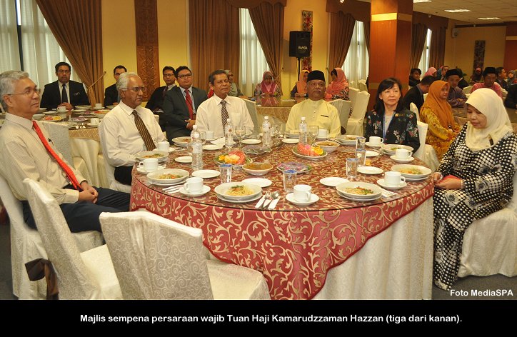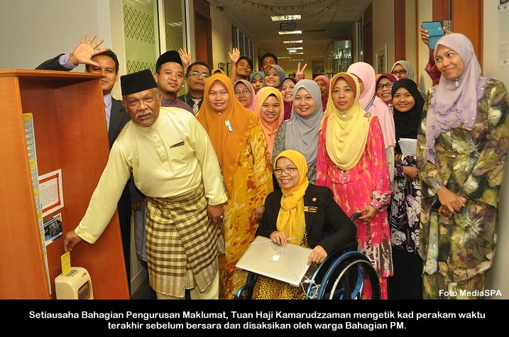 PUTRAJAYA, 26 April ------ Setiausaha Bahagian Pengurusan Maklumat (BPM) Tuan Haji Kamarudzzaman Hassan bersara wajib mulai 26 April 2015. Satu majlis ringkas sempena persaraannya telah diadakan pada Jumaat lepas. Majlis turut dihadiri Pengerusi S.P.A, Tan Sri Mahmood Adam, Timbalan Pengerusi, Dato’ R. Segarajah. Hadir sama pegawai-pegawai kanan serta warga Bahagian Pengurusaan Maklumat. Dalam ucapan ringkas Tuan Haji Kamarudzzaman mengucapkan terima kasih kepada warga S.P.A kerana memberi kerjasama kepada beliau dalam menjalankan tugas-tugas selama berada di S.P.A. ------ MediaSPA