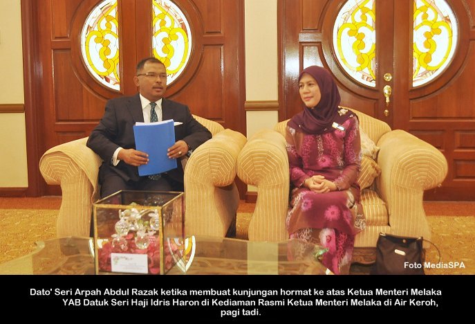 MELAKA, 1 Sept ------ Pengerusi S.P.A Dato’ Seri Arpah Abdul Razak hari ini telah membuat kunjungan hormat ke atas Ketua Menteri Melaka, YAB Datuk Seri Haji Idris Haron di Ayer Keroh, Melaka pagi tadi. Pengerusi S.P.A itu turut diiringi Setiausaha Puan Lim Mooi Eia dan Timbalan Setiausaha (Pengambilan) Dato’ Zainal Abidin Ahmad. Hadir sama Setiausaha Kerajaan Negeri Melaka, Datuk Wira Haji Naim Abu Bakar. Kunjungan selama 45 minit itu diadakan di kediaman rasmi Ketua Menteri. Seterusnya Dato’ Seri Arpah mengadakan Mesyuarat bersama-sama Exco Hal Ehwal Syarikat, Sumber Manusia dan NGO, YB Datuk M.S Mahadeven serta pegawai-pegawai kanan pejabat Ketua Menteri. ------ MediaSPA