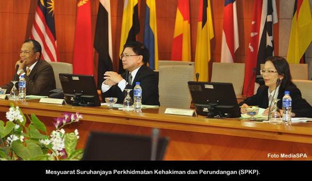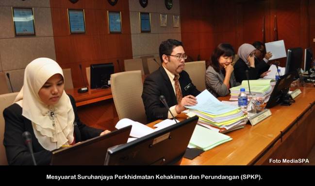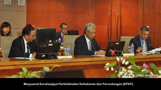 PUTRAJAYA, 11 Mac------ Suruhanjaya Perkhidmatan Kehakiman dan Perundangan (SPKP) telah mengadakan Mesyuarat Suruhanjaya kali ke-123 pada 11 Mac 2014 di Wilayah Persekutuan Putrajaya. Mesyuarat talah dipengerusikan oleh YBhg. Tan Sri Mahmood Adam, Pengerusi SPKP dan dihadiri Ahli-Ahli SPKP iaitu YBhg. Peguam Negara, YAA Presiden Mahkamah Rayuan Malaysia, YAA Hakim Besar Malaya, YAA Hakim Besar Sabah dan Sarawak, YA Hakim Mahkamah Rayuan serta YA Hakim Mahkamah Tinggi. Mesyuarat turut dihadiri YBhg. Datuk Ramli Juhari, Setiausaha SPKP, Jemaah Pegawai SPKP iaitu YBhg. Peguam Cara Negara, YBhg. Ketua Pendaftar Mahkamah Persekutuan dan pegawai-pegawai kanan Urus Setia SPKP. Pihak SPKP telah menimbang dan membuat keputusan melibatkan 150 Pegawai Undang-Undang pelbagai gred bagi urusan Pelantikan Pegawai Undang-Undang, Kenaikan Pangkat, Pemangkuan, Pelepasan Peminjaman dan Tindakan Tatatertib. Selain itu, sebanyak 36 kertas pertimbangan Suruhanjaya secara edaran (e-Circulation SPKP) dan urusan pengesahan dalam perkhidmatan, pemberian taraf berpencen serta penetapan gaji permulaan oleh Jemaah Pegawai SPKP telah diratifikasikan oleh Suruhanjaya. ------ SPKP/MediaSPA