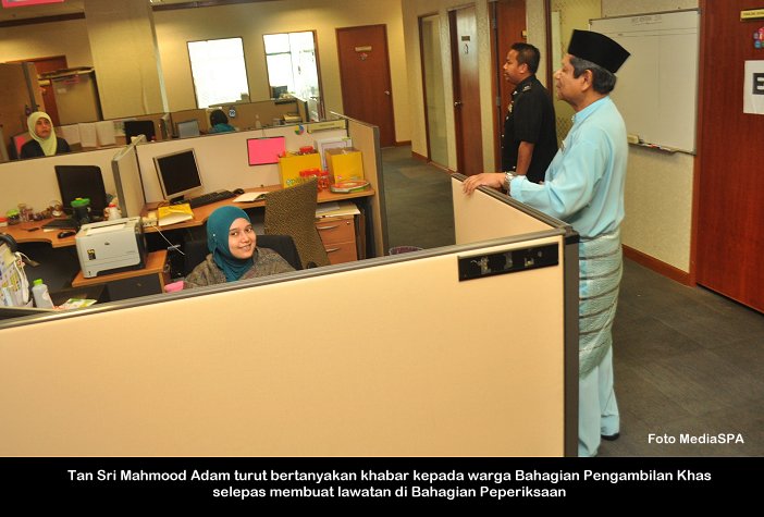 SPA, 6 Disember ------ Pengerusi S.P.A, YBhg. Tan Sri Mahmood Adam hari ini berkata supaya penghantaran kertas soalan peperiksaan yang dilaksanakan oleh Bahagian Peperiksaan mestilah mengikut garis panduan Arahan Keselamatan yang telah ditetapkan. Beliau berkata demikian semasa lawatan ke bahagian itu pagi ini. Menurutnya lagi, cara penghantaran soalan-soalan peperiksaan yang tidak mengikut garis panduan boleh menyebabkannya mudah terdedah kepada kebocoran soalan, hilang atau jatuh ke tangan pihak-pihak yang tidak bertanggungjawab semasa proses penghantaran soalan itu ke setiap negeri. Terdahulu dari itu, YBhg. Tan Sri Mahmood Adam turut melawat Bahagian Pengurusan Maklumat, Bahagian Pengambilan Khas dan bilik operasi “One Stop Centre” S.P.A. ----- MediaSPA
