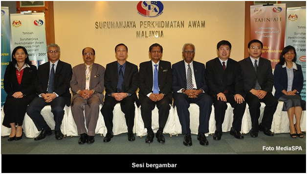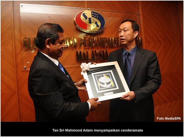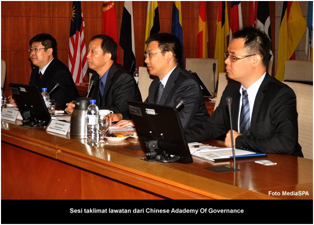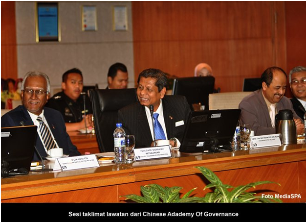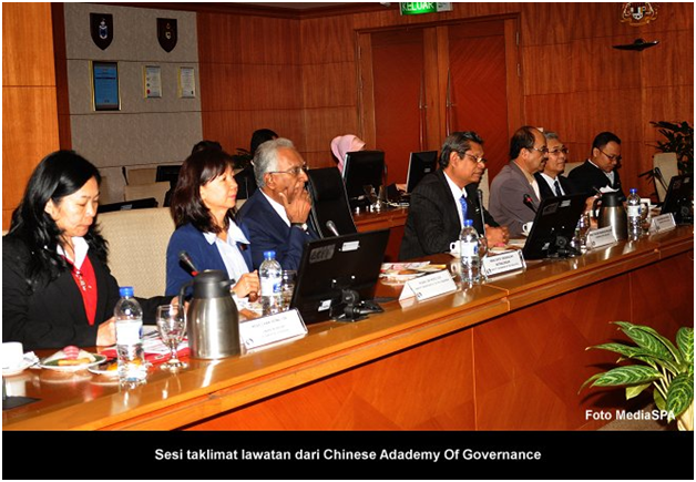 S.P.A, 15 Januari ------ Suruhanjaya Perkhidmatan Awam telah menerima kunjungan dari "Chinese Academy Of Governance". Rombongan daripada Beijing, China seramai tiga orang pegawai diketuai oleh Qin Sichai, Director General, Department Of Education Planning. Satu taklimat mengenai SPA telah disampaikan oleh YBhg. Tan Sri Mahmood Adam di bilik Mesyuarat Suruhanjaya. Turut hadir Timbalan Pengerusi, YBhg. Dato' R. Segarajah, Setiausaha SPA, YBhg. Datuk Ramli Juhari, Timbalan Setiausaha Perkhidmatan, Puan Lim Mooi Eia, Timbalan Setiausaha Pengambilan, Encik Zainal Abidin Ahmad dan pegawai-pegawai kanan SPA. Sejurus selepas selesai sesi taklimat, YBhg. Tan Sri Mahmood Adam menyampaikan cenderamata kenangan kepada Qin Sichai dan delegasi. ------ MediaSPA