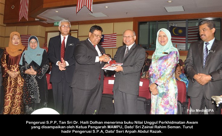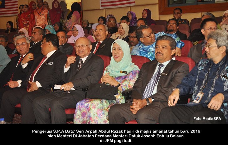 PUTRAJAYA 21 Jan -----Warga Suruhanjaya Perkhidmatan Awam (S.P.A), Suruhanjaya Perkhidmatan Pelajaran Malaysia (SPP) dan Unit Pemodenan Tadbiran Dan Perancangan Pengurusan Malaysia (MAMPU) hari ini telah hadir di majlis Amanat Tahun Baru 2016 bersama Menteri di Jabatan Perdana Menteri Datuk Joseph Entulu Belaun di Putrajaya. Turut hadir Pengerusi SPP Tan Sri Dr. Haili Dolhan, Pengerusi S.P.A Dato’ Seri Arpah Abdul Razak, Ketua Pengarah MAMPU dan pegawai-pegawai kanan. Di majlis itu juga MAMPU telah melancarkan buku bertajuk “Nilai Unggul Perkhidmatan Awam”, Teks ucapan Menteri telah disampaikan oleh Pengerusi SPP, Tan Sri Dr. Haili Dolhan. ----- MediaSPA