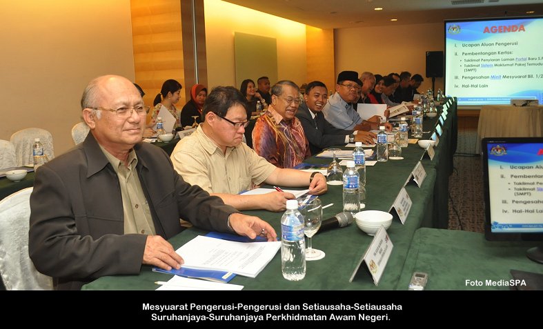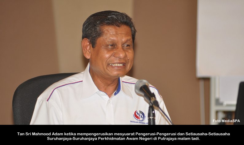PUTRAJAYA, 11 Mei ------ Pengerusi S.P.A, Tan Sri Mahmood Adam telah mengadakan mesyuarat bersama Pengerusi-Pengerusi dan Setiausaha-Setiausaha, Suruhanjaya Suruhanjaya Perkhidmatan Awam Negeri di Putrajaya malam tadi. Mesyuarat yang bermula jam 8.30 malam turut dihadiri Pengerusi Suruhanjaya Perkhidmatan Pelajaran Malaysia (SPP) Datuk Dr. Haili Dolhan. Antara agenda yang dibentangkan ialah taklimat mengenai Portal S.P.A yang baharu dan Sistem Maklumat Pakej Temuduga (SMPT). ----- MediaSPA