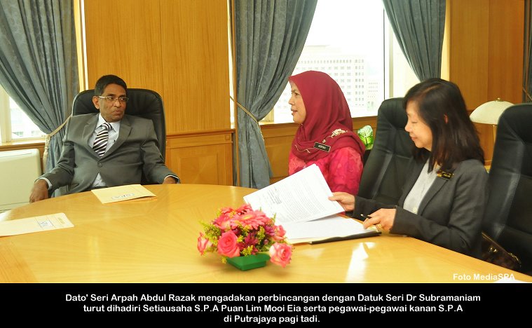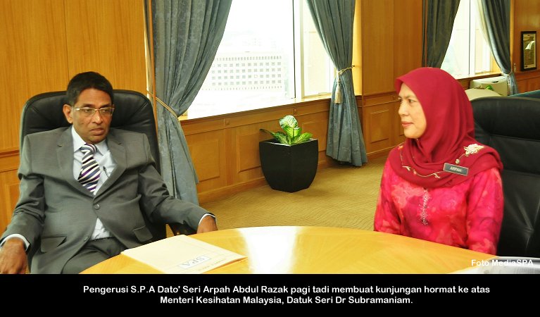 PUTRAJAYA, 11 Ogos------ Pengerusi S.P.A, Dato’ Seri Arpah Abdul Razak pagi tadi mengadakan Kunjungan Hormat Ke atas Menteri Kesihatan Malaysia, YB Datuk Seri Dr. S. Subramaniam di pejabatnya di Putrajaya. Turut hadir Setiausaha S.P.A Puan Lim Mooi Eia serta pegawai-pegawai kanan dan seterusnya mengadakan perbincangan selama 50 minit. ------ MediaSPA