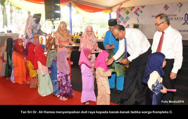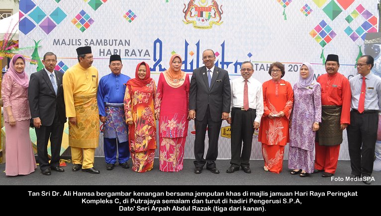 PUTRAJAYA, 14 Ogos------ Ketua Setiausaha Negara (KSN), Tan Sri Dr. Ali Hamsa hadir di majlis jamuan hari raya yang diadakan di dataran Kompleks C, Putrajaya semalam. Majlis turut di hadiri Ketua Pengarah Perkhidmatan Awam (KPPA), Tan Sri Mohamad Zabidi Zainal, Pengerusi S.P.A Dato’ Seri Arpah Abdul Razak, Ketua Jabatan dan semua warga Kompleks C. Tan Sri Dr. Ali Hamsa turut menyampaikan duit raya kepada kanak-kanak tadika warga S.P.A. ------ MediaSPA