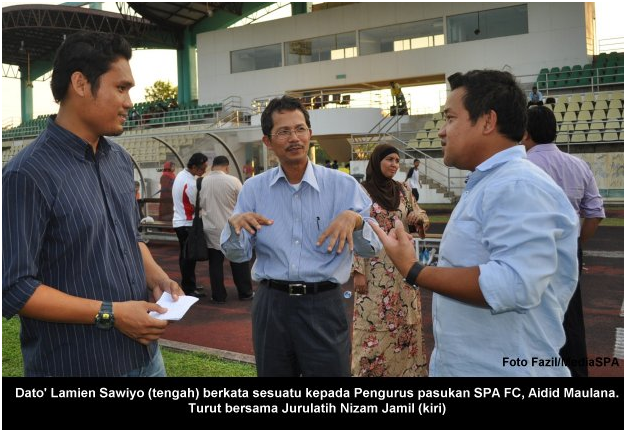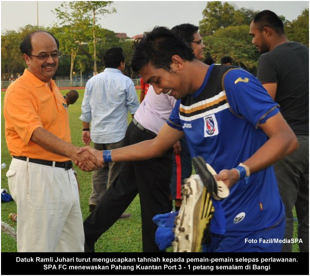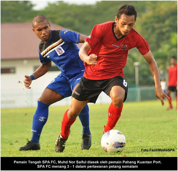 BANGI, 5 April ----- SPA FC berjaya menewaskan Shahzan Muda (Pahang Kuantan Port) dengan jaringan 3 – 1 dalam perlawanan Liga FAM 2012 yang berlangsung di Stadium Mini Petronas, Bangi petang semalam. Jaringan pertama SPA FC diperolehi melalui Mohd Zulkifli Affendi pada minit ke-43. Khairol Azry Abdul Rahman menambah jaringan kedua SPA FC pada minit ke – 53. Pemain gantian, Muhammad Ariffin Norazidi menambah derita pasukan pelawat itu dengan jaringan ketiga pada minit ke-84. Turut menyaksikan perlawanan, Presiden SPA FC YBhg. Dato’ Lamien Sawiyo dan Timbalan Presiden YBhg. Datuk Ramli Juhari. Ketika mengulas kemenangan SPA FC ke atas pasukan pelawat YBhg. Dato’ Lamien Sawiyo berkata pasukan SPA FC masih dapat menumpukan perlawanan Liga FAM ini walaupun telah meninggalkan perlawanan kerana terlibat dalam perlawanan Piala FA ” Pasukan SPA FC masih fokus untuk menuju destinasi iaitu pencapaian terbaik untuk menjadi juara Liga FAM bagi tahun 2012 ini”. Beliau juga berharap supaya pemain-pemain memberi tumpuan dan prestasi seperti perlawanan ini untuk perlawanan-perlawanan seterusnya. ----- MediaSPA