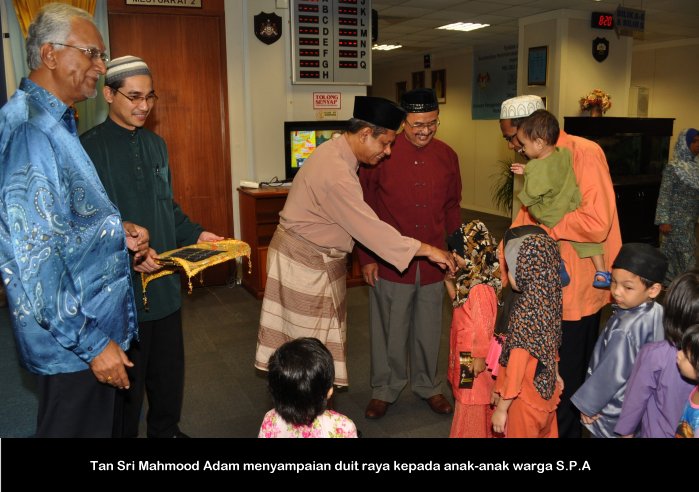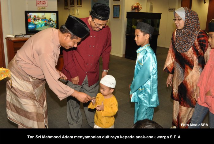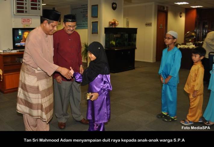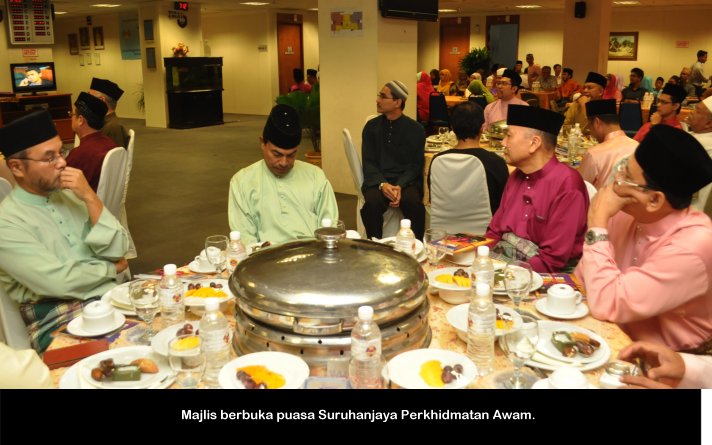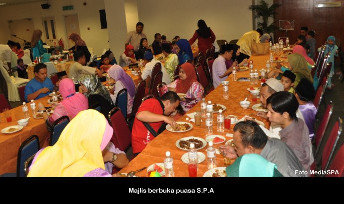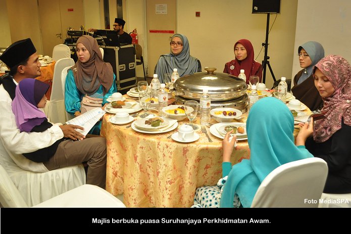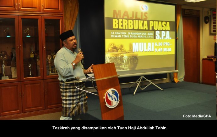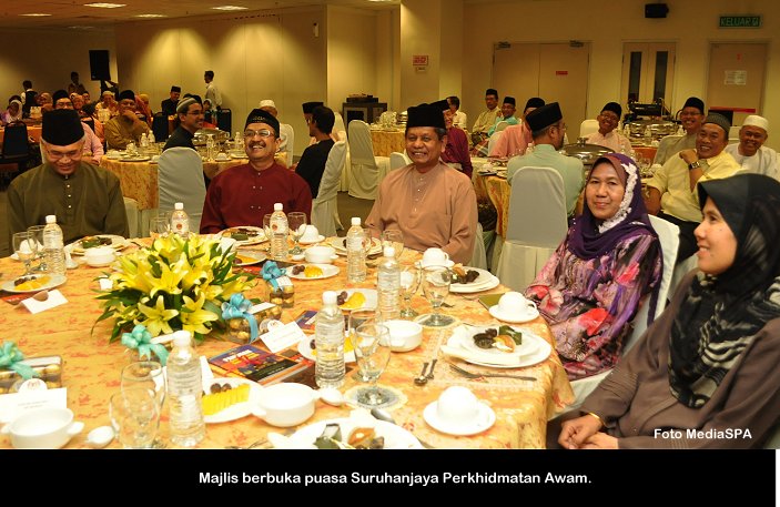 PUTRAJAYA, 15 Julai ------ Suruhanjaya Perkhidmatan Awam (S.P.A) mengadakan majlis berbuka puasa yang diadakan di dewan temu duga S.P.A Putrajaya petang semalam. Majlis anjuran PASPA dan PUSPANITA itu turut dihadiri Pengerusi S.P.A Tan Sri Mahmood Adam bersama isteri Puan Sri Nabihah Haji Hassan. Hadir Sama Timbalan Pengerusi Dato’ R. Segarajah, Ahli-Ahli Suruhanjaya, Pegawai tugas-tugas khas, Setiausaha Datuk Ramli Juhari warga S.P.A dan keluarga. Majlis dimulakan dengan tazkirah yang disampaikan oleh Tuan Haji Abdullah Tahir. Tan Sri Mahmood Adam juga menyampaikan duit raya kepada anak-anak warga S.P.A yang hadir. ------MediaSPA