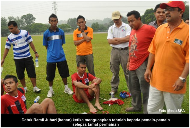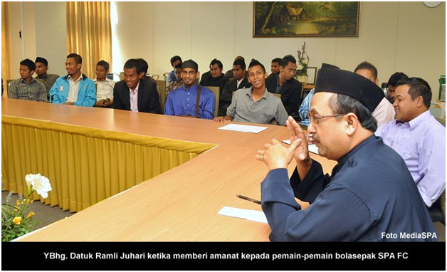 SPA, 18 Februari ------ Timbalan Presiden Pasukan Bola Sepak SPA FC, YBhg. Datuk Ramli Juhari berkata, semua pemain bolasepak SPA mestilah berfikir secara positif, lupakan semua masalah apabila di atas padang dan memberi tumpuan kepada permainan dengan matlamat untuk menang. Beliau berkata demikian ketika memberi amanat kepada pemain-pemain Pasukan Bola Sepak SPA FC jumaat lepas. SPA FC akan bertemu pasukan MBJB dalam perlawanan bolasepak Piala FA di Stadium Mini Petronas, Bangi jam 4.15 petang esok (Sabtu). Beliau juga mengingatkan kepada pemain-pemain supaya tidak terlibat dengan rasuah. YBhg. Datuk Ramli juga memberi penghargaan kepada pasukan SPA FC kerana dengan adanya pasukan ini secara tidak langsung mempromosikan Suruhanjaya Perkhidmatan Awam Malaysia kepada orang ramai. Beliau merujuk kepada akhbar-akhbar utama yang memaparkan jadual perlawanan antara SPA FC dengan MBJB. Sementara itu Pengurus pasukan, Encik Aidid Molana berkata, pemain-pemain mestilah memberikan komitmen dan bermain secara berpasukan. ------ MediaSPA