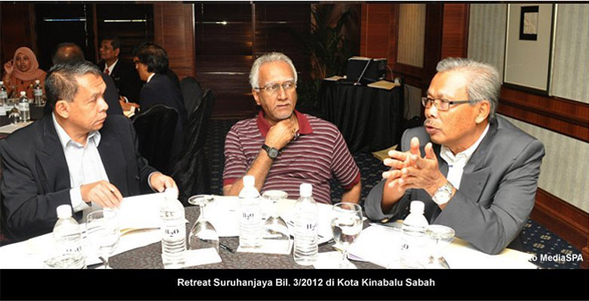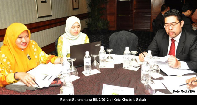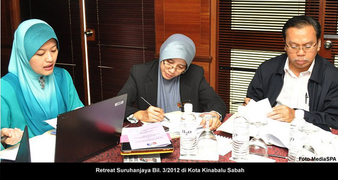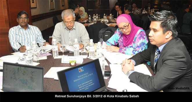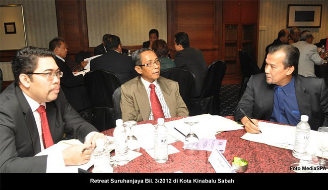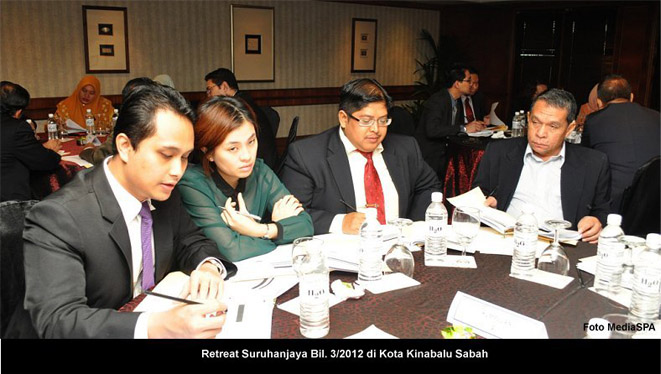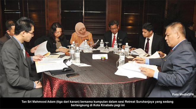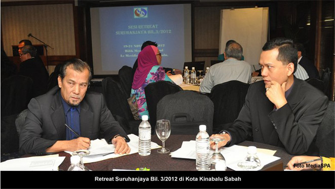 KOTA KINABALU 20 November----- Suruhanjaya Perkhidmatan Awam Malaysia (SPA) hari ini telah mengadakan sesi Retreat Suruhanjaya. Sesi Retreat Bil 3/2012 yang bermula malam tadi hingga Rabu ini dihadiri oleh Pengerusi SPA, YBhg. Tan Sri Mahmood Adam, Timbalan Pengerusi, YBhg. Dato' Segarajah Ratnalingam, Ahli-Ahli Suruhanjaya, Setiausaha, YBhg. Datuk Ramli Juhari dan pegawai-pegawai kanan SPA. Sementara itu pada malam tadi, SPA telah mengadakan mesyuarat mingguan Suruhanjaya Bil 38/2012 yang dipengerusikan oleh YBhg. Tan Sri Mahmood Adam. ----- MediaSPA
