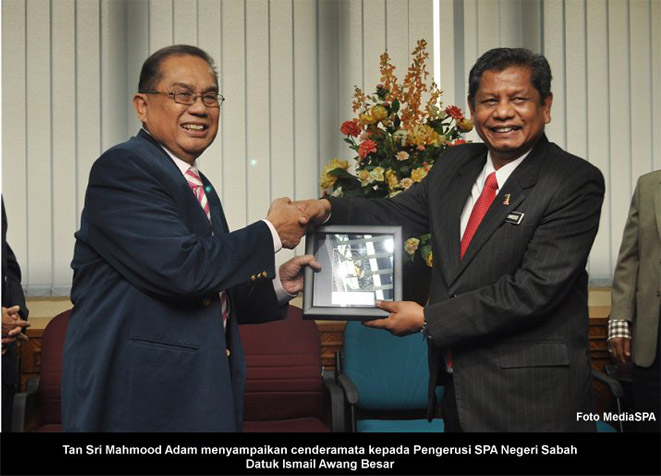 KOTA KINABALU 20 November----- Suruhanjaya Perkhidmatan Awam Malaysia (SPA) petang ini telah mengadakan perjumpaan bersama SPA Negeri Sabah. Delegasi dari SPA Malaysia telah diketuai oleh Pengerusi SPA, YBhg. Tan Sri Mahmood Adam. Hadir sama YBhg. Dato' Segarajah Ratnalingam, Ahli-Ahli Suruhanjaya, Setiausaha SPA, YBhg. Datuk Ramli Juhari serta pegawai-pegawai kanan. Ketibaan delegasi disambut oleh Pengerusi SPA Negeri Sabah YBhg. Datuk Ismail Awang Besar. Satu taklimat dari SPA Negeri telah disampaikan oleh YBhg. Datuk Iamail Awang Besar di Pejabat SPA Negeri di Kota Kinabalu. ----- MediaSPA