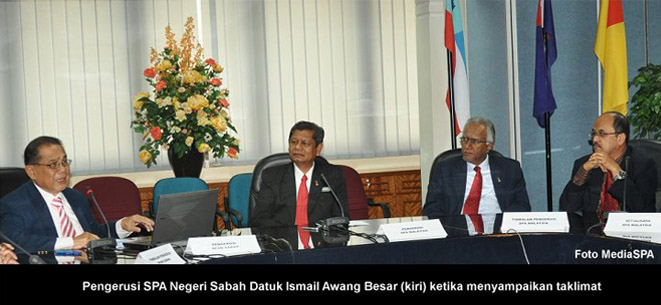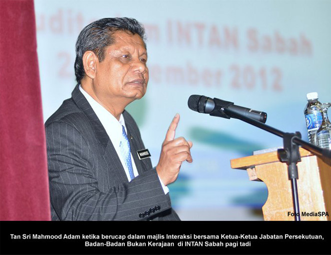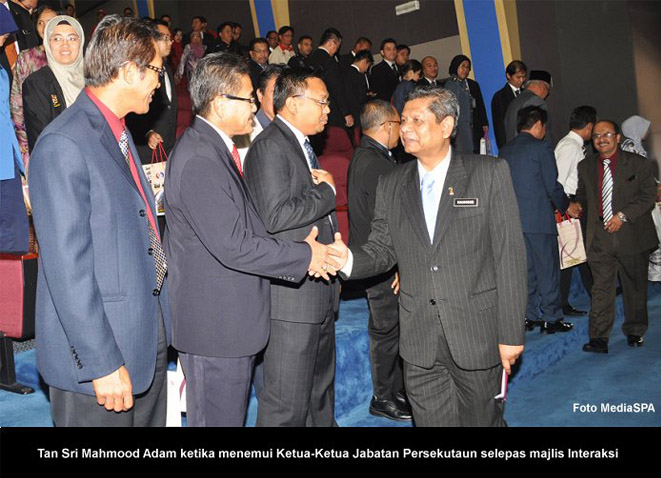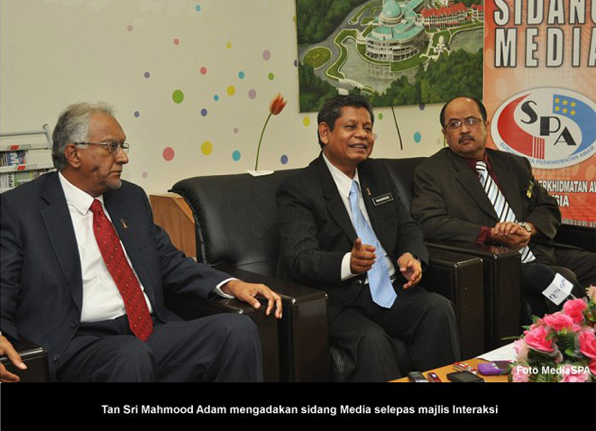 KOTA KINABALU 21 November-----Pengerusi SPA, YBhg. Tan Sri Mahmood Adam pagi ini telah mengadakan majlis Interaksi bersama Ketua-Ketua Jabatan Persekutuan, Badan-Badan Bukan Kerajaan. Persatuan-Persatuan dan Pemimpin-Pemimpin Masyarakat Sabah. Majlis yang diadakan di INTAN Sabah itu turut dihadiri oleh YBhg. Dato' R. Segarajah, Setiausaha SPA, YBhg. Datuk Ramli Juhari. Hadir sama Setiausaha Persekutauan Sabah, YBhg. Dato' Abu Bakar Hassan. Sejurus selepas selesai majlis Interaksi, YBhg. Tan Sri Mahmood Adam telah mengadakan sidang media di tempat yang sama ----- MediaSPA