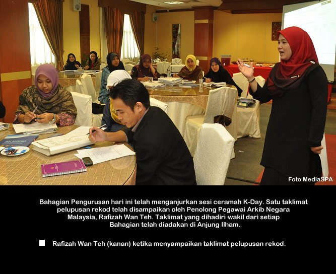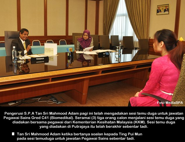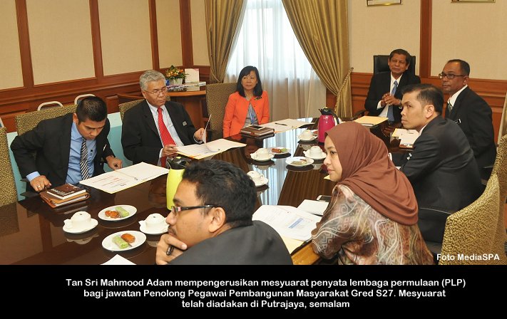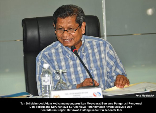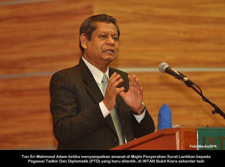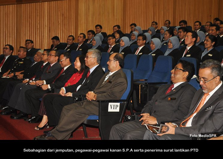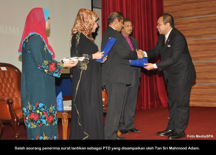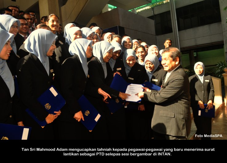 KUALA LUMPUR, 6 Jun ------ Pengerusi S.P.A Tan Sri Mahmood Adam hari ini berkata, apabila seseorang itu dilantik sebagai kakitangan kerajaan mestilah patuh kepada peraturan-peraturan dan terikat kepada undang-undang yang telah ditetapkan. Beliau berkata demikian dihadapan 97 orang Pegawai Tadbir Dan Diplomatik (PTD) yang baru menerima surat lantikan dari Suruhanjaya Perkhidmatan Awam (S.P.A). Katanya lagi, Pegawai Tadbir Dan Diplomatik juga adalah menjadi tulang belakang kepada kerajaan. Turut hadir dimajlis ialah Timbalan Ketua Pengarah Perkhidmatan Awam (Pembangunan) Dato’ Dr. Sharifah Zarah Syed Ahmad. Hadir Sama Setiausaha S.P.A Datuk Ramli Juhari, Pengarah INTAN Dato’ Dr . Mazlan Yusoff serta pegawai-pegawai kanan S.P.A. Majlis yang diadakan di Auditorium INTAN Bukit Kiara, berakhir sebentar tadi. ------ MediaSPA
