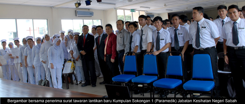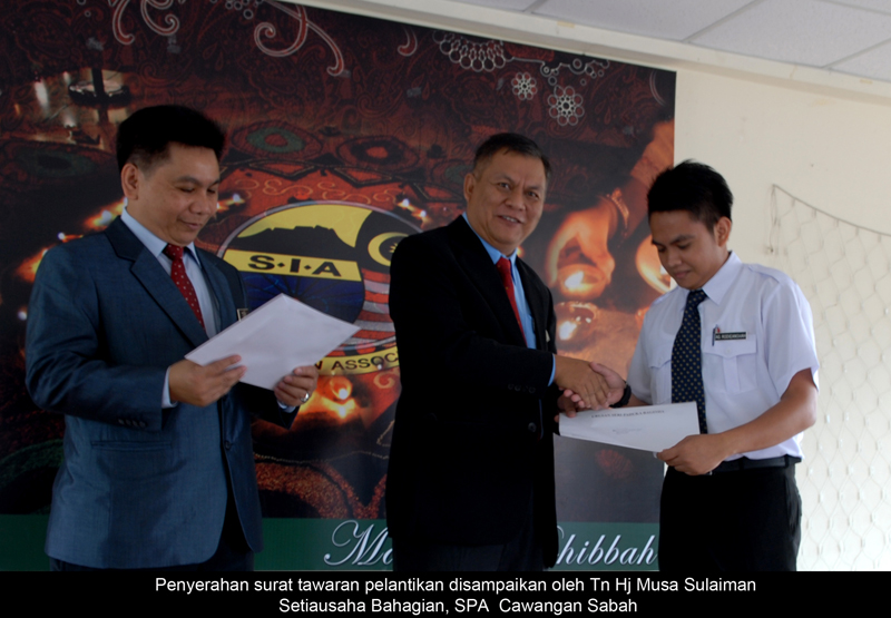 Kota Kinabalu, 29 Julai ----- Majlis penyerahan surat tawaran pelantikan bagi jawatan Jururawat Masyarakat Gred U19 dan Penolong Pegawai Perubatan Gred U29 telah diadakan di Dewan Persatuan India, Bahagian Pergigian Jabatan Kesihatan Negeri Sabah. Penyerahan surat tawaran ini disampaikan oleh Tn Hj Musa bin Sulaiman, Setiausaha Bahagian SPA Cawangan Sabah yang turut dihadiri oleh Timbalan Pengarah Kesihatan Negeri Sabah, Encik Toisin Gantor.
