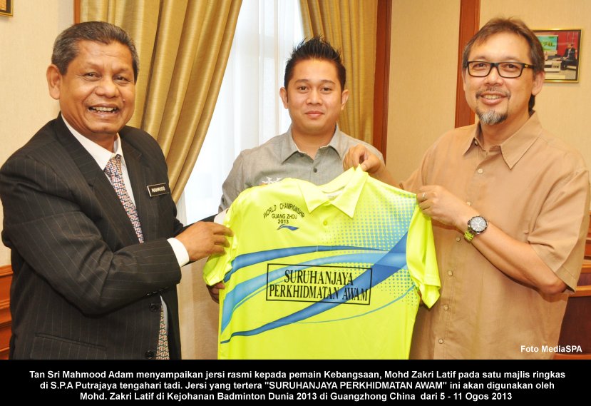 SPA, 31 Julai ------- Pengerusi S.P.A, YBhg. Tan Sri Mahmood Adam hari ini telah menyampaikan jersi rasmi S.P.A kepada pemain Badminton Kebangsaan, Mohd. Zakri Latif yang akan menyertai Kejohanan Badminton Dunia di Guangzhou, China dari 5 hingga 11 Ogos depan. Mohd Zakri akan menyarung jersi yang tertera nama "SURUHANJAYA PERKHIDMATAN AWAM" dan menjadi pakaian rasmi beliau sepanjang kejohanan tersebut. Dalam majlis ringkas yang diadakan di Bilik Mesyuarat Pengerusi sebentar tadi, YBhg. Tan Sri Mahmood Adam turut mengucapkan selamat maju jaya kepada Mohd. Zakri dan menasihati beliau agar menjaga displin dan nama baik negara. Mohd. Zakri akan ke Guangzhou pada Jumaat ini dan akan ditemani jurulatih Razif Sidek. ------ MediaSPA.
