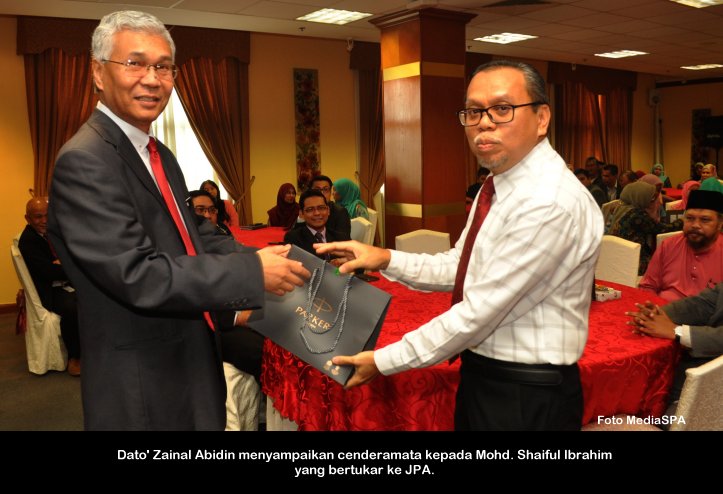 PUTRAJAYA, 17 November ----- Setiausaha SPA, YBhg. Dato’ Zainal Abidin Ahmad hadir ke majlis ringkas perjumpaan bersama Timbalan Setiausaha (Pengambilan) Tuan Haji Abdullah Tahir yang akan bersara wajib pada Ahad 19 November 2017. Majlis ringkas yang diadakan di Anjung Ilham semalam, turut dihadiri Timbalan Setiausaha (Perkhidmatan) Encik Ikhbal Hanam Mukras dan pegawai-pegawai kanan SPA serta kakitangan Bahagian Pengambilan. ----- MediaSPA