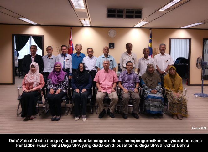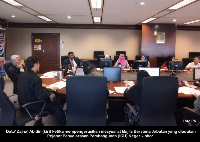 JOHOR BAHRU, 18 November ----- Setiausaha SPA, YBhg. Dato’ Zainal Abidin Ahmad telah mempengerusikan Mesyuarat Majlis Bersama Jabatan (MBJ) yang diadakan di Pejabat Penyelarasan Pembangunan (ICU) Negeri Johor, di Johor Bahru pada Sabtu lepas. Mesyuarat turut dihadiri Timbalan Setiausaha (Perkhidmatan) Encik Ikhbal Hanam Mukras. YBhg. Dato’ Zainal Abidin juga turut mempengerusikan mesyuarat penyelarasan pentadbir pusat temu duga SPA, yang diadakan di pusat temu duga SPA Johor Bahru. ----- MediaSPA