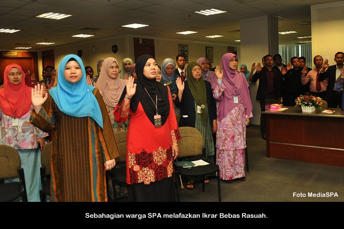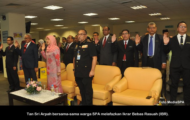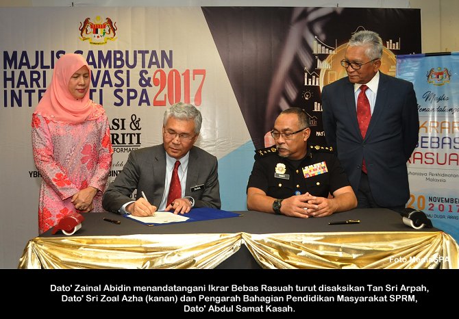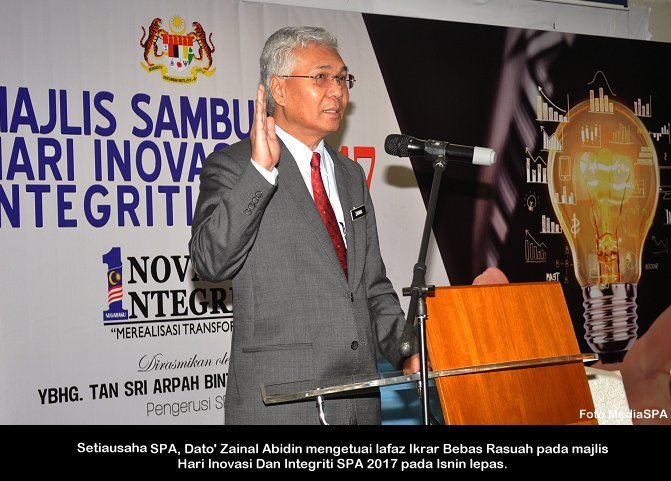 PUTRAJAYA, 20 November ----- Pengerusi SPA, YBhg. Tan Sri Arpah Abdul Razak telah merasmikan sambutan Hari Inovasi dan Integriti Suruhanjaya Perkhidmatan Awam Malaysia Tahun 2017, yang diadakan di Putrajaya. Sambutan yang bertemakan “Integriti dan Inovasi Merealisasi Transformasi” turut dihadiri Timbalan Pengerusi SPA, YBhg. Dato’ Sri Zoal Azha Yusof. Hadir sama Setiausaha SPA, YBhg. Dato’ Zainal Abidin Ahmad, Timbalan Setiausaha (Perkhidmatan) Encik Ikhbal Hanam Mukras, pegawai-pegawai kanan serta warga SPA. Pada majlis itu juga, Setiausaha SPA, YBhg. Dato’ Zainal Abidin Ahmad menandatangani Ikrar Bebas Rasuah dan turut disaksikan oleh Timbalan Pesuruhjaya SPRM, YBhg. Dato’ Abdul Samat Kasah. Dalam ucapan perasmian yang disampaikan oleh YBhg. Tan Sri Arpah, beliau berkata, majlis ini adalah sebagai menzahirkan bahawa warga SPA sangat komited memerangi rasuah, salah guna kuasa dan penyelewangan. Katanya lagi, dalam konteks SPA sebagai jabatan yang terlibat dalam melantik penjawat awam, kita harus memastikan konsep integriti ini sentiasa dipegang dan dengan adanya lafaz Ikrar ini menunjukkan komitmen kita bagi memperkukuhkan interiti dilaksanakan secara berterusan. ----- MediaSPA