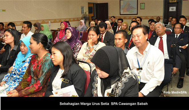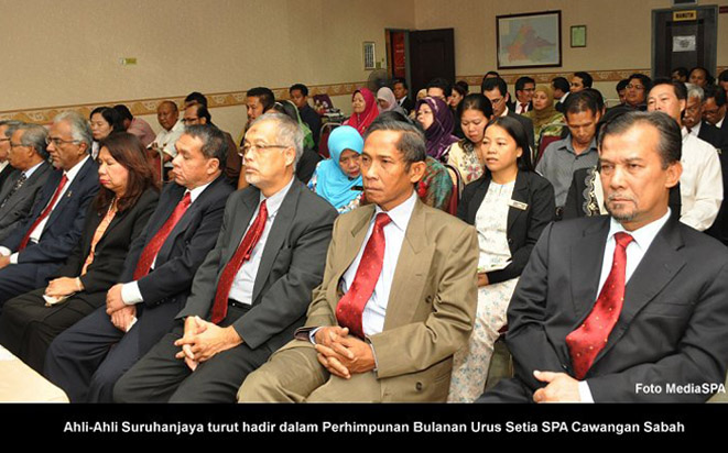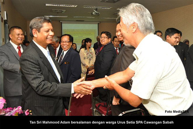 KOTA KINABALU 21 November----- Pengerusi SPA YBhg. Tan Sri Mahmood Adam mengingatkan Warga SPA supaya menjaga nama baik Suruhanjaya Perkhidmatan Awam. "Jaga nama baik SPA dan Kerajaan, kerana kalau kita (SPA) buat silap, orang melihat Kerajaan yang silap". Beliau berkata demikian dalam ucapan di Perhimpunan bulanan Urus Setia SPA Cawangan Sabah, di Kota Kinabalu sebentar tadi. Hadir sama Timbalan Pengerusi, YBhg. Dato' R. Segarajah, Setiausaha SPA, YBhg. Datuk Ramli Juhari, Ahli-Ahli Suruhanjaya, pegawai-pegawai kanan dan warga Urus Setia SPA Cawangan Sabah. Beliau juga mengingatkan Warga SPA supaya berhati-hati ketika menjalankan tugas supaya tidak membuat keputusan yang melanggar peraturan atau Perlembagaan. Terdahulu dari itu, YBhg. Tan Sri Mahmood Adam mengucapkan terima kasih kerana menjemput beliau untuk datang ke pejabat Urus Setia Cawangan Sabah di sini. Di akhir perhimpunan, YBhg. Pengerusi sempat bermesra dengan Warga SPA dan melawat bilik temu duga di sini.----- MediaSPA