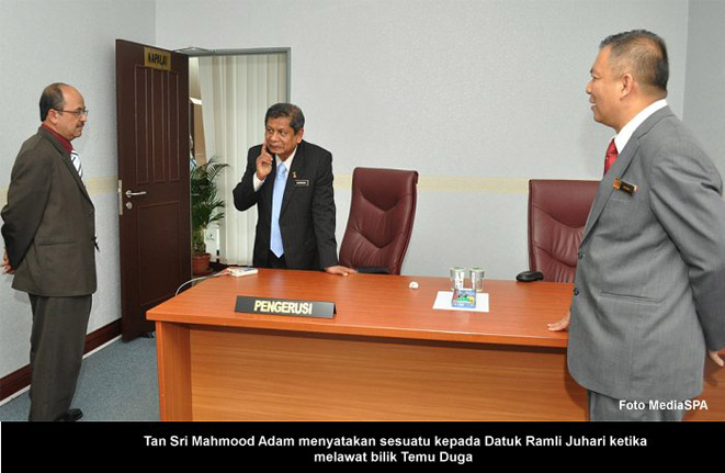 PUTRAJAYA, 17 Jun ------ Pengerusi S.P.A Tan Sri Mahmood Adam pagi ini menjalankan sesi temu duga seawal jam 7.30 pagi. Sesi temu duga jawatan Pembantu Tadbir (Perkeranian/Operasi) Gred N17 ini ialah atas permintaan calon tersebut kerana beliau tidak mendapat cuti dari majikannya. Seramai 17 orang calon Gred 17 akan ditemu duga oleh Pengerusi S.P.A pada hari ini. Sebelum ini, S.P.A juga mengadakan sesi temu duga pada waktu malam serta hujung minggu atas permintaan calon. ------ MediaSPA