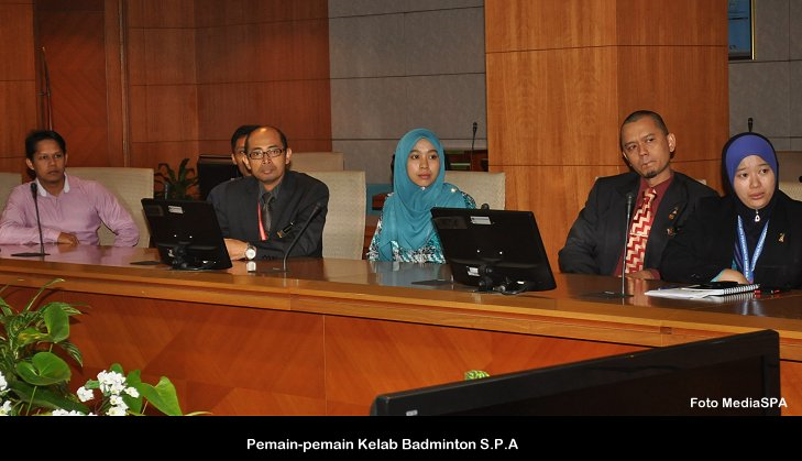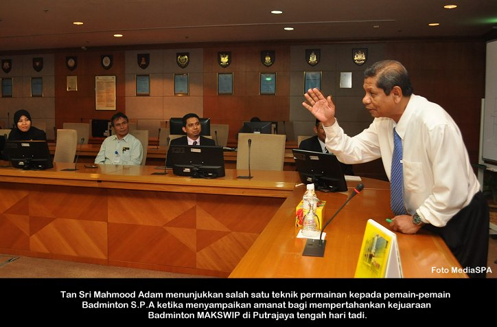 PUTRAJAYA, 17 Jun ------ Penaung Kelab Badminton S.P.A Tan Sri Mahmood Adam hari ini telah mengadakan perjumpaan bersama pemain-pemain Kelab Badminton S.P.A dan menyampaikan amanat bagi mempertahankan kejohanan Badminton MAKSWIP 2014 yang sedang berlangsung mulai semalam hingga Khamis ini, di Kuala Lumpur. Beliau yang turut memberi suntikan semangat juga mahukan pemain yang terlibat menjaga nama baik Suruhanjaya Perkhidmatan Awam dan bermain dengan semangat kesukanan serta menjaga disiplin. S.P.A telah muncul juara dalam perlawanan badminton MAKSWIP buat pertama kali pada tahun lepas dan misi mempertahankan kejuaraan adalah matlamat utama pada tahun ini, katanya beliau. ------ MediaSPA