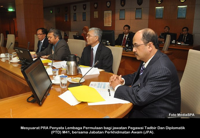 PUTRAJAYA 6 Jan ----- Suruhanjaya Perkhidmatan Awam Malaysia (S.P.A) hari ini telah mengadakan Mesyuarat jawatankuasa Pegawai Tadbir Dan Diplomatik (PTD) Assessment Centre (PAC) bagi pengambilan Kadet PTD tahun 2016. Mesyuarat dipengerusikan oleh Timbalan Setiausaha (Pengambilan) Tuan Haji Abdullah Tahir. Turut hadir wakil pegawai daripada Kementerian Pelajaran Malaysia (KPM), Kementerian Belia dan Sukan (KBS), Jabatan Perkhidmatan Awam (JPA) dan Kementerian Kesihatan Malaysia (KKM). ----- MediaSPA