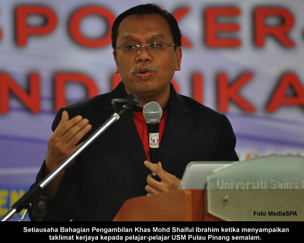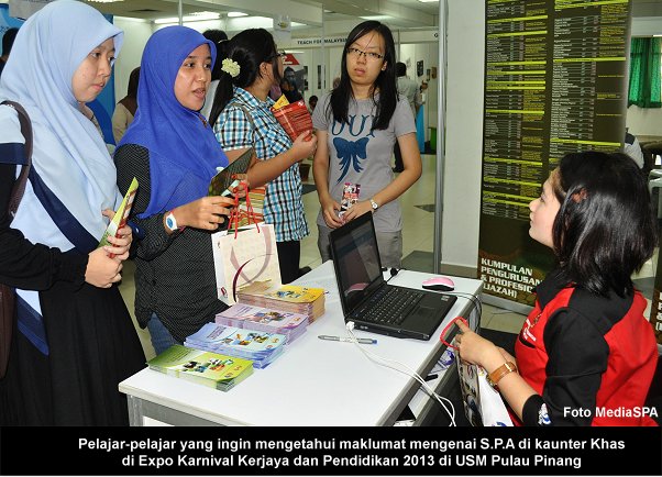 PULAU PINANG, 28 April ------ Suruhanjaya Perkhidmatan Awam (S.P.A) dengan kerjasama Universiti Sains Malaysia (USM) telah mengadakan Karnival Kerjaya dan Pendidikan 2013 yang diadakan di Dewan Utama Pelajar Kampus Induk USM, Pulau Pinang. Karnival Kerjaya tiga (3) hari yang bermula pada hari Jumaat turut disertai oleh pelbagai Kementerian dan jabatan dari sektor awam dan swasta. Suruhanjaya Perkhidmatan Awam telah membuka kaunter khas untuk memberi penerangan kepada pengunjung-pengunjung dari sekitar Pulau Pinang dan juga pelajar-pelajar di USM. Satu taklimat mengenai peluang kerjaya dalam perkhidmatan awam telah disampaikan oleh Setiausaha Bahagian Pengambilan Khas, Encik Mohd. Shaiful Bin Ibrahim. ------ MediaSPA