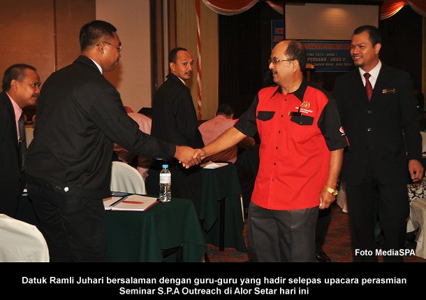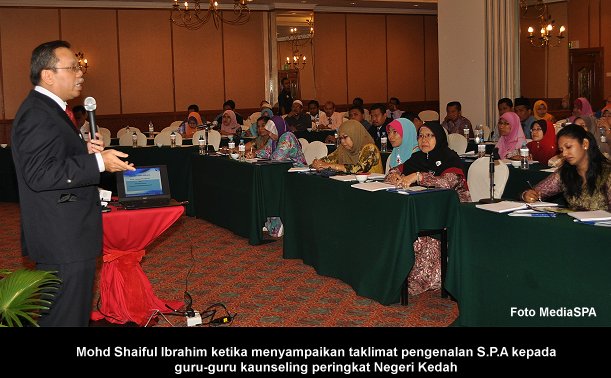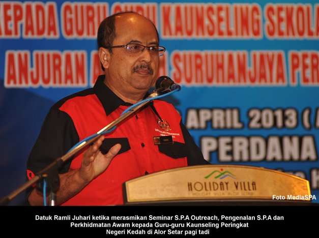 ALOR SETAR, 28 April ------ Setiausaha S.P.A, YBhg. Datuk Ramli Juhari telah merasmikan Seminar S.P.A Outreach “Pengenalan S.P.A dan Perkhidmatan Awam kepada Guru-guru Kaunseling Peringkat Negeri Kedah”. Seminar sehari yang diadakan ini adalah anjuran ASPA dengan kerjasama Kementerian Pelajaran Malaysia. Turut hadir Timbalan Setiausaha (Pengambilan) Encik Zainal Abidin Ahmad dan Ketua Sektor Pengurusan Pembangunan Kemanusiaan JPN Kedah Tuan Haji Mohammad Haji Abd. Hamid . Sesi taklimat telah disampaikan iaitu Pengenalan S.P.A dan Perkhidmatan Awam serta Peluang Kerjaya Dalam Perkhidmatan Awam yang disampaikan oleh Setiausaha Bahagian Pengambilan Khas, Encik Mohd Shaiful Ibrahim. Sesi taklimat terakhir bertajuk Laluan kerjaya Masa Hadapan yang disampaikan oleh Encik Muhammad Khairil Amran Abu Bakar, Penolong Pengarah Jabatan Tenaga Kerja Negeri Kedah. ------ MediaSPA