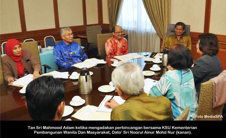 PUTRAJAYA, 15 Mei ------ Pengerusi S.P.A Tan Sri Mahmood Adam pagi ini telah mengadakan perjumpaan bersama Ketua Setiausaha Kementerian Pembangunan Wanita Dan Masyarakat, Dato’ Sri Noorul Ainur Mohd Nur. Turut hadir Setiausaha S.P.A Datuk Ramli Juhari dan Timbalan Setiausaha (Pengambilan) Zainal Abidin Ahmad. Perbincangan selama 25 minit yang diadakan di bilik Mesyuarat Pengerusi berakhir sebentar tadi. ------ MediaSPA