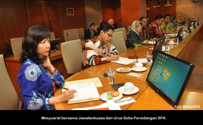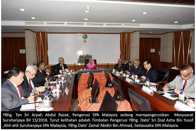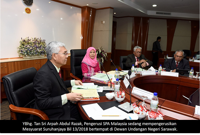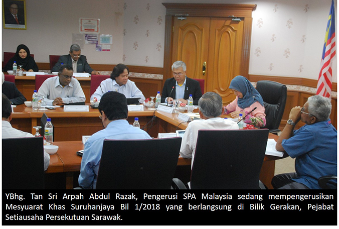 KUCHING, SARAWAK 12 April ----- Pada 10-11 April 2018 telah berlangsungnya Mesyuarat Suruhanjaya Bil. 13/2018 yang bertempat di Dewan Undangan Negeri Sarawak dan Mesyuarat Khas Suruhanjaya Bil. 1/2018 bertempat di Bilik Gerakan, Pejabat Setiausaha Persekutuan Sarawak di Kuching, Sarawak. Kali ini, SPA Malaysia Cawangan Sarawak telah terpilih sebagai tuan rumah dengan kerjasama Bahagian Urus Setia Mesyuarat, SPA Malaysia. Mesyuarat-mesyuarat tersebut telah dipengerusikan oleh YBhg. Tan Sri Arpah Abdul Razak, Pengerusi SPA Malaysia. Turut hadir ke mesyuarat-mesyuarat berkenaan ialah Timbalan Pengerusi YBhg. Dato’ Sri Zoal Azha Bin Yusof ,Ahli-ahli Suruhanjaya SPA Malaysia, YBhg. Dato’ Zainal Abidin Bin Ahmad, Setiausaha SPA Malaysia serta pegawai-pegawai SPA Malaysia yang lain. ----- Urus Setia Sarawak
