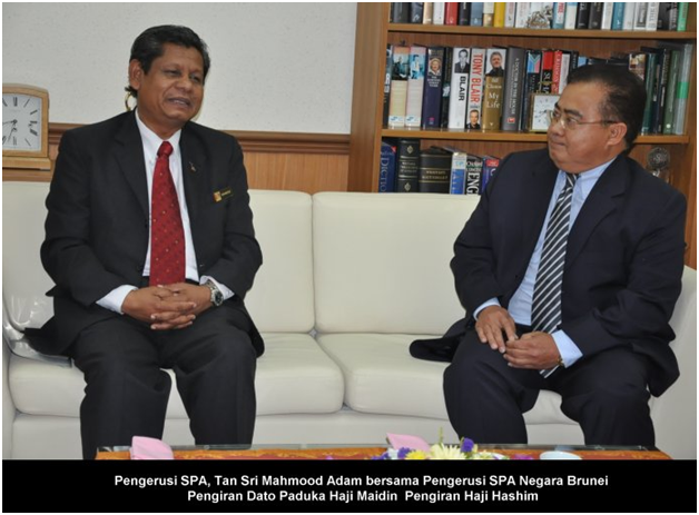 BRUNEI 6 September------ Suruhanjaya Perkhidmatan Awam Malaysia (SPA) telah mengadakan kunjungan hormat ke Suruhanjaya Perkhidmatan Awam Negara Brunei pada 6 September 2012 bagi bertukar pandangan dan pengalaman berkaitan urusan pengambilan, perkhidmatan dan naik pangkat dan tatatertib di negara tersebut. Ketibaan delegasi dari SPA Malaysia telah disambut oleh Pengerusi SPA Negara Brunei, Pengiran Dato Paduka Haji Maidin Bin Pengiran Haji Hashim. Delegasi SPA Malaysia seramai 15 orang telah diketuai oleh YBhg. Tan Sri Mahmood Bin Adam. Turut serta 4 orang Ahli-Ahli Suruhanjaya SPA Malaysia, Setiausaha SPA Malaysia, YBhg. Dato’ Lamien Bin Sawiyo serta pegawai-pegawai kanan SPA Malaysia. Terdahulu sebelum itu, YBhg. Tan Sri Mahmood Bin Adam telah mengadakan Sesi Interaksi bersama ketua-ketua Jabatan Persekutuan, Badan Berkanun dan Badan Bukan Kerajaan yang diadakan di Majlis Daerah Limbang, Sarawak pada 5 September 2012 bertujuan untuk mendapatkan maklum balas daripada Kementerian, Jabatan dan Pentadbiran Negeri terhadap perkhidmatan yang ditawarkan oleh SPA. ------ MediaSPA