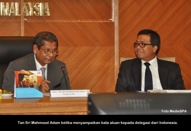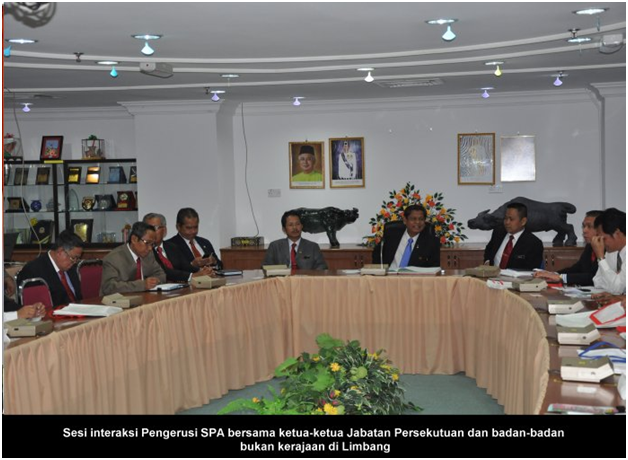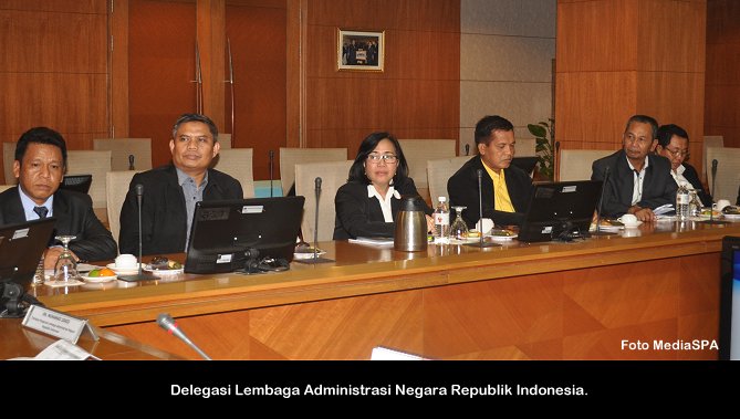 PUTRAJAYA, 19 Mei ------ Suruhanjaya Perkhidmatan Awam Malaysia (S.P.A) telah menerima kunjungan dari Lembaga Administrasi Negara Republik Indonesia, semalam. Delegasi seramai 18 pegawai-pegawai itu diketuai oleh Timbalan Pengerusinya, Dr. Muhamad Idris. Ketibaan rombongan disambut oleh Tan Sri Mahmood Adam dan sesi taklimat mengenai S.P.A turut disampaikan oleh beliau.  ------  MediaSPA