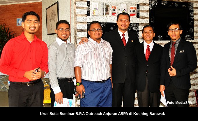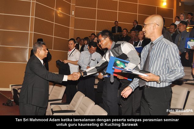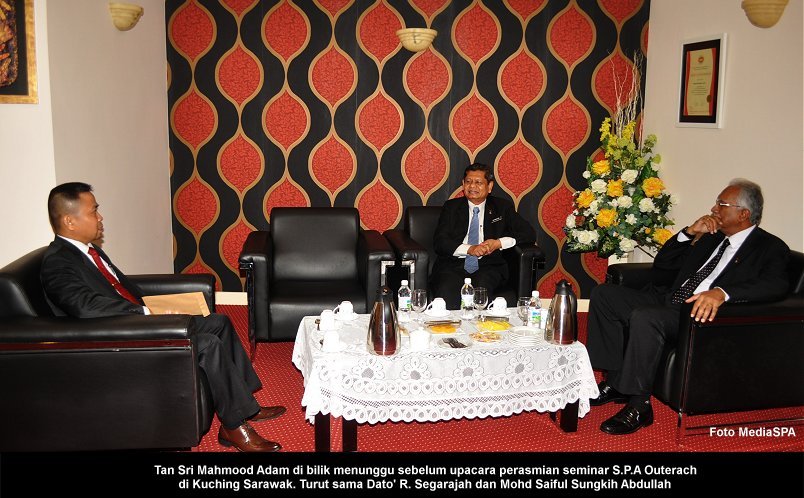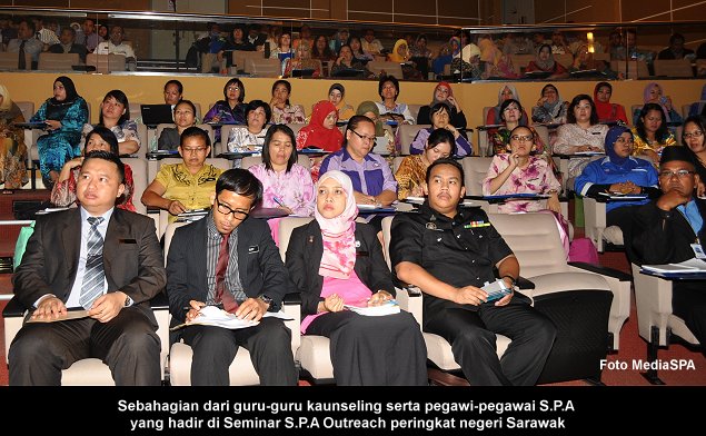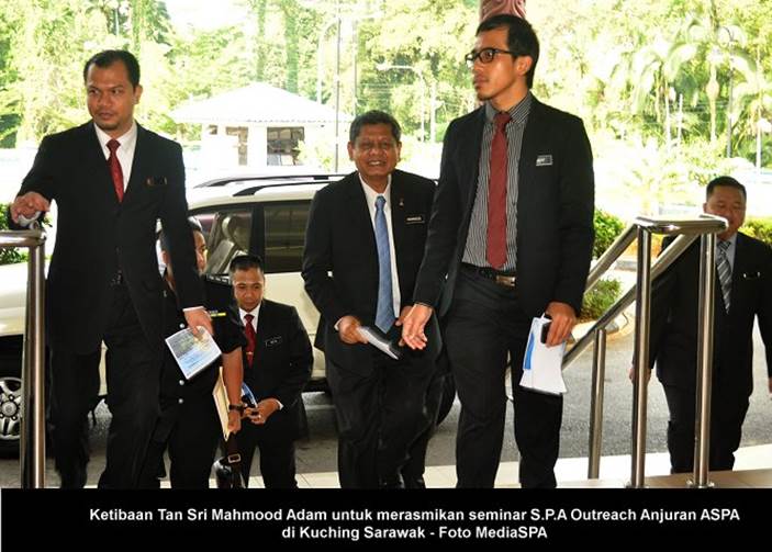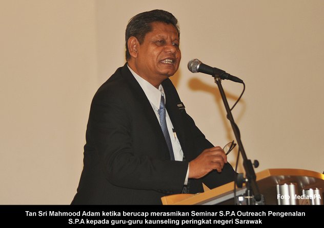 KUCHING, 15 Mei ------ Pengerusi S.P.A, YBhg. Tan Sri Mahmood Adam hari ini telah merasmikan "Seminar S.P.A Outreach-Pengenalan S.P.A dan Perkhidmatan Awam Kepada Guru-Guru Bimbingan Dan Kaunseling Peringkat Negeri Sarawak" . Hadir sama Timbalan Pengerusi YBhg. Dato' R. Segarajah dan Setiausaha Bahagian Urus Setia S.P.A Cawangan Sarawak Encik Mohd. Saiful Sungkih Abdullah. Seminar anjuran ASPA dengan kerjasama Kementerian Pelajaran Malaysia telah diadakan di Islamic Information Centre (IIC), Sarawak. Seramai 169 peserta hadir dan sesi taklimat mengenai S.P.A dan Perkhidmatan Awam telah disampaikan oleh Ketua Penolong Setiausaha Bahagian Pengambilan Khas, Puan Khadijah Ishak dan Puan Mavis Janang dari JPN Negeri Sarawak. ------ MediaSPA