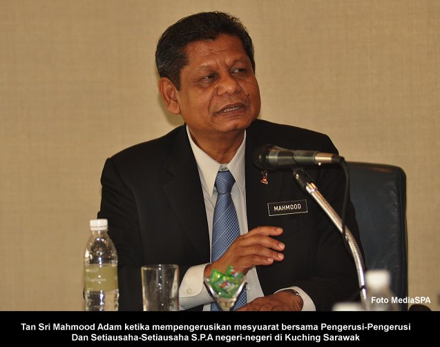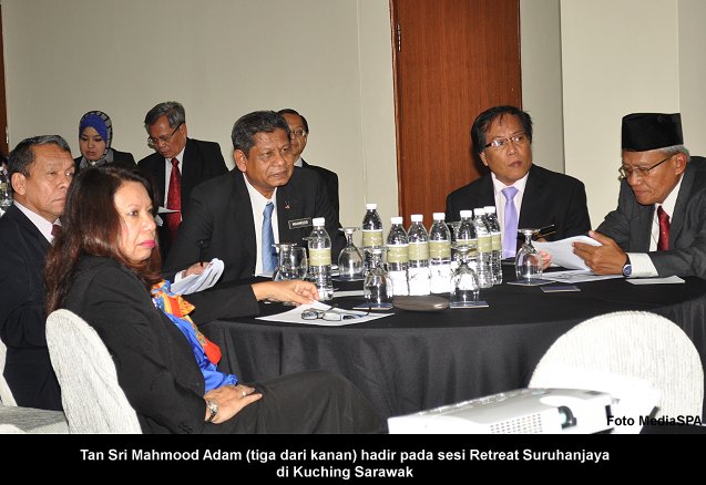 KUCHING, 15 Mei ------ Pengerusi S.P.A, YBhg. Tan Sri Mahmood Adam hari ini telah mengadakan mesyuarat bersama Pengerusi-Pengerusi dan Setiausaha-Setiausaha S.P.A Negeri. Turut hadir Timbalan Pengerusi S.P.A, YBhg. Dato' R. Segarajah dan Setiausaha S.P.A, YBhg. Datuk Ramli Juhari. Terdahulu dari itu, YBhg. Tan Sri Mahmood Adam telah hadir di Sesi Rumusan Retreat Suruhanjaya. Retreat Suruhanjaya yang bermula hari Isnin lepas turut dihadiri oleh Ahli-Ahli Suruhanjaya dan pegawai-pegawai kanan S.P.A. Pada sebelah petang pula, YBhg. Tan Sri Mahmood Adam turut membuat perjumpaan bersama NGO Dayak. Seramai 17 persatuan dari NGO Dayak telah hadir bagi mengkaji penyertaan kaum Dayak ke dalam Perkhidmatan Awam di seluruh Sarawak. ------ MediaSPA