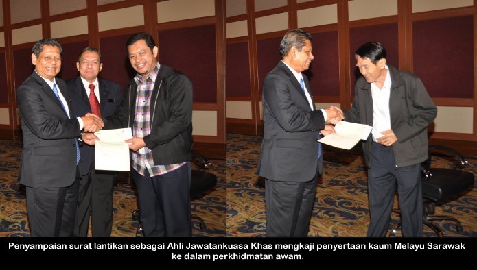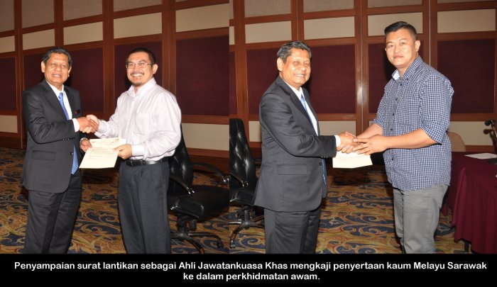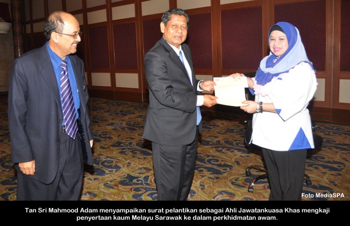 KUCHING, 24 JUN ------ Pengerusi S.P.A Tan Sri Mahmood Adam hari ini menyarahkan surat lantikan kepada 14 orang wakil NGO sebagai Ahli Jawatankuasa Khas mengkaji penyertaan kaum Melayu ke dalam perkhidmatan awam. Majis penyerahan surat lantikan dilakukan selepas Mesyuarat bersama NGO Melayu Sarawak, di Kuching malam tadi. ------ MediaSPA