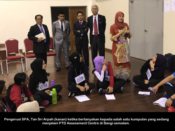 BANGI, 26 Februari ----- Pengerusi SPA YBhg. Tan Sri Arpah Abdul Razak telah membuat lawatan ke Institut Kemajuan Desa (INFRA) Bangi, Selangor untuk melihat sendiri calon-calon bagi jawatan Pegawai Tadbir dan Diplomatik (PTD) 2018 yang sedang menjalani PTD Assessment Centre (PAC). Lawatan ini turut dihadiri Setiausaha SPA, YBhg. Dato’ Zainal Abidin Ahmad dan pegawai-pegawai kanan SPA. Aktiviti hari ketiga yang bermula jam 7.00 pagi itu dihadiri seramai 207 orang calon. ----- MediaSPA
