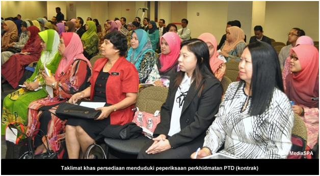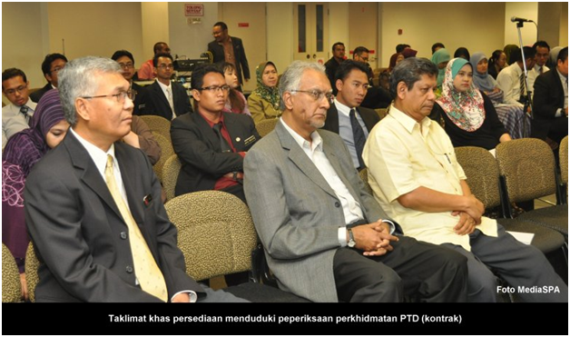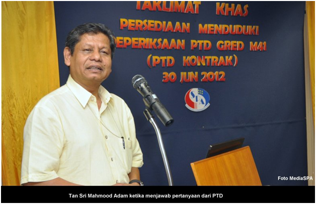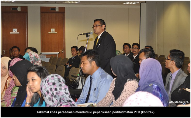 SPA 30 Jun ------ Pengerusi SPA, YBhg. Tan Sri Mahmood Adam berkata, tiada peperiksaan khas kepada Pegawai Tadbir Dan Diplomatik (PTD) bertaraf kontrak yang gagal dalam peperiksaan yang akan tamat kontraknya pada penghujung tahun ini. Beliau berkata demikian ketika menjawab pertanyaan salah seorang PTD (Kontrak) dalam sesi soal jawab di majlis taklimat persediaan menduduki Peperiksaan Memasuki Perkhidmatan PTD Gred M41 di dewan Temu duga Aras 6 pagi tadi. Seramai 80 orang PTD (Kontrak) hadir di majlis itu. Semua pegawai-pegawai yang hadir ini tidak lulus ujian peperiksaan dari tahun 2008, 2009 dan 2010. ”Tiada peperiksaan khas untuk anda, ia terbuka untuk semua”, ujarnya. Beliau juga tidak mahu mereka menyalahkan mana-mana pihak apabila gagal dalam peperiksaan. Menjawab satu soalan lagi, YBhg. Tan Sri Mahmood Adam berkata, SPA tidak boleh berjanji akan mengadakan peperiksaan semula dalam masa terdekat atau menyambung kontrak PTD yang akan tamat. Bagaimanapun mereka ini boleh kembali ke jawatan asal. Hadir sama, Timbalan Pengerusi SPA, YBhg. Dato’ Segarajah Ratnalingam dan Setiausaha Bahagian Pengambilan, Encik Zainal Abidin Ahmad. Terdahulu dari itu satu sesi penerangan mengenai sukatan peperiksaan dan Assesment Centre telah disampaikan oleh Setiausaha Bahagian Peperiksaan, Puan Faidzah Arshad. Penerangan mengenai penulisan Karangan Bahasa Melayu telah disampaikan oleh Puan Sri Halimah Abdul Majid dari SMK Putrajaya dan penulisan Karangan Bahasa Inggeris oleh Puan Usha Diane a/p Dannis dari SMK Convent Bukit Nenas. ------ MediaSPA