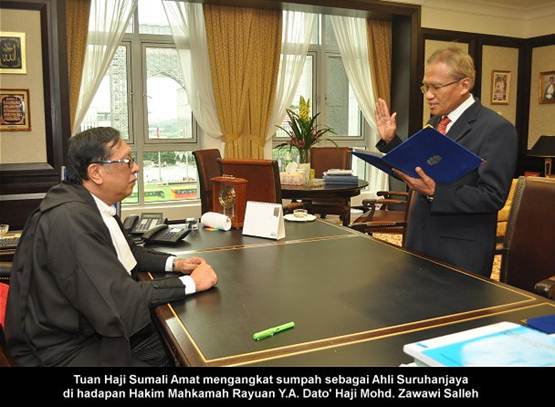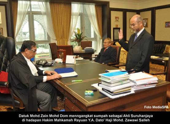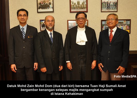 S.P.A, 19 Februari ------ Suruhanjaya Perkhidmatan Awam (S.P.A) hari ini telah menerima dua (2) orang Ahli Suruhanjaya yang baru iaitu YBhg. Datuk Mohd Zain Mohd Dom dan Tuan Haji Sumali Amat. Upacara mengangkat sumpah telah dilakukan dihadapan Hakim Mahkamah Rayuan, Y.A. Dato' Haji Mohd. Zawawi Salleh di Istana Kehakiman di Putrajaya petang tadi dengan diiringi Setiausaha Bahagian Urus Setia Mesyuarat, Encik Shafarin Bin Nasuredin. Selepas upacara mengangkat sumpah, YBhg. Datuk Mohd Zain Mohd Dom dan Tuan Haji Sumali Amat telah mengadakan perjumpaan bersama Pengerusi S.P.A, YBhg. Tan Sri Mahmood Adam dan menandatangani surat penerimaan jawatan secara rasmi. ------ MediaSPA