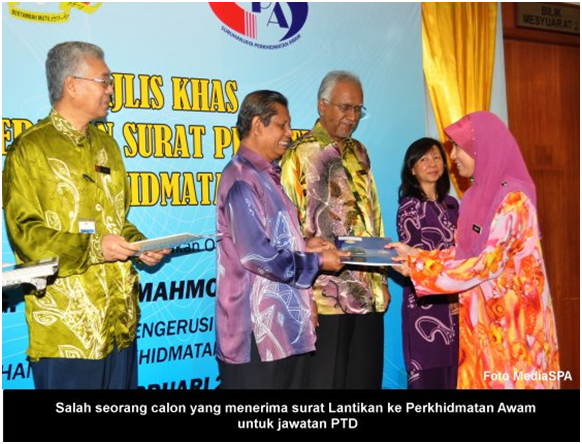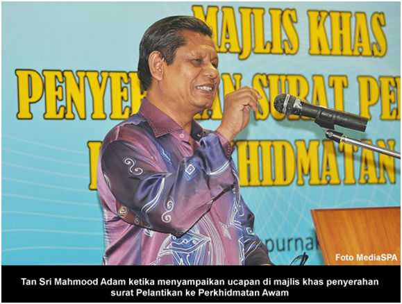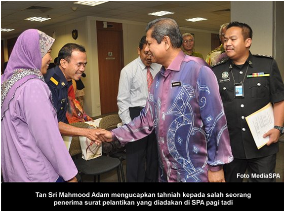 S.P.A, 21 Februari ------ Pengerusi S.P.A, YBhg. Tan Sri Mahmood Adam hari ini telah menyampaikan surat tawaran lantikan ke perkhidmatan awam kepada 298 calon yang telah berjaya dalam temu duga yang dijalankan oleh S.P.A baru-baru ini. Turut hadir, Timbalan Pengerusi S.P.A YBhg. Dato' R. Segarajah, Timbalan Setiausaha (Pengambilan), Encik Zainal Abidin Ahmad, Timbalan Setiausaha (Perkhidmatan), Puan Lim Mooi Eia dan pegawai-pegawai kanan S.P.A. Majlis Khas tersebut telah berlangsung di Dewan Temu Duga S.P.A Putrajaya. Dalam ucapan yang disampaikan oleh Tan Sri Mahmood Adam, "Inilah kali pertama S.P.A menyerahkan surat secara terus kepada calon yang berjaya dan ini merupakan Transformasi yang ke-36 dilakukan oleh S.P.A". Majlis khas pada hari ini melibatkan calon-calon bagi jawatan Pegawai Tadbir dan Diplomatik Gred M41, Pegawai Perubatan Gred UD41, Pegawai Farmasi Gred U41, Pegawai Pergigian Gred U41, Penolong Pegawai Teknologi maklumat Gred F29 dan Penolong Pegawai Penguat kuasa Gred N27. Satu sidang media turut diadakan selepas majlis penyampaian berakhir. ------ MediaSPA