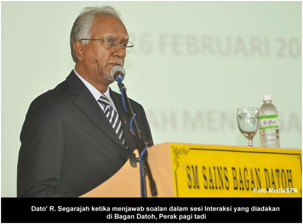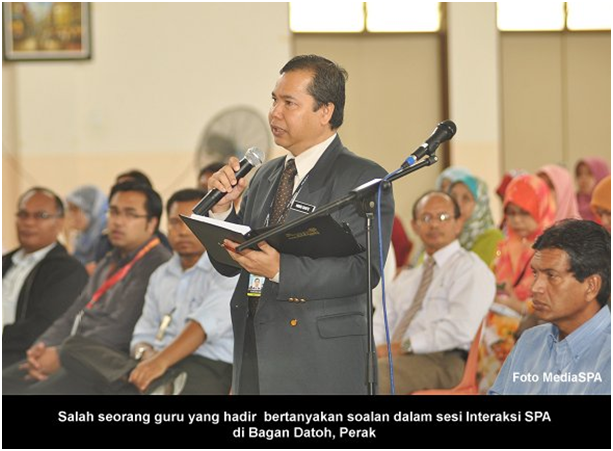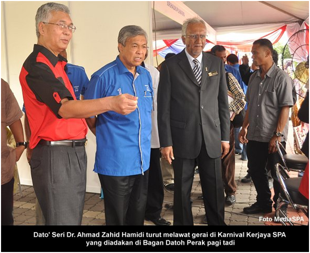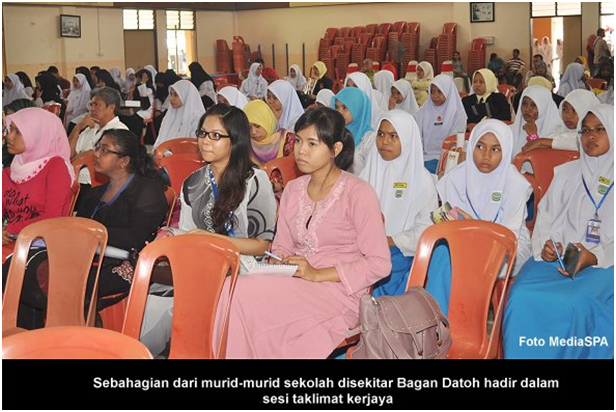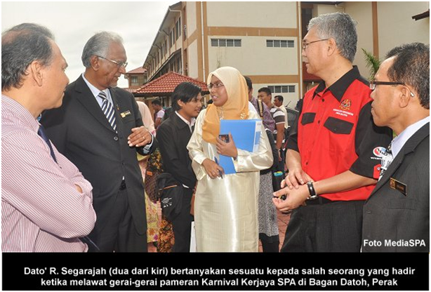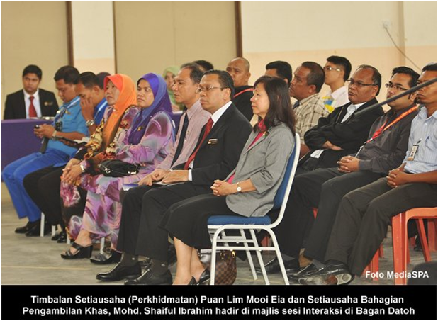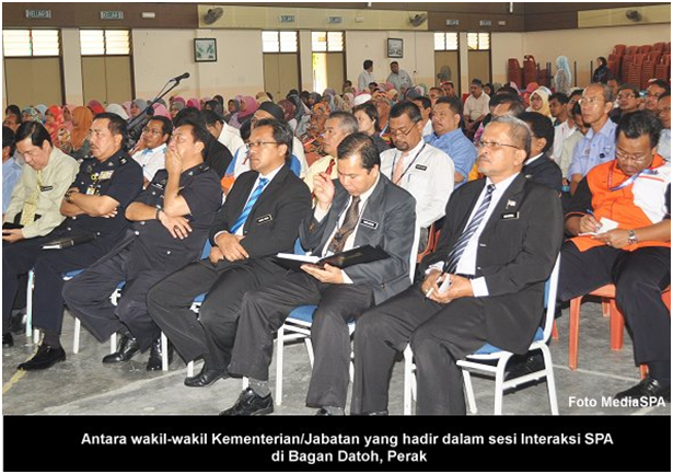 BAGAN DATOH, 26 Februari ------ Suruhanjaya Perkhidmatan Awam Malaysia (S.P.A) hari ini telah mengadakan Sesi Interaksi bersama Ketua-Ketua Jabatan Persekutuan, Badan-Badan Berkanun, Persatuan-persatuan dan Badan-Badan bukan Kerajaan di Sekolah Menengah Sains Bagan Datoh, Perak. Sesi interaksi yang ke-15 ini dihadiri oleh Timbalan Pengerusi S.P.A, YBhg. Dato' R. Segarajah. Turut hadir Timbalan Setiausaha (Pengambilan), Encik Zainal Abidin Ahmad, Timbalan Setiausaha (Perkhidmatan), Puan Lim Mooi Eia dan pegawai-pegawai kanan S.P.A. Sesi Taklimat Kerjaya juga diadakan yang telah dihadiri oleh pelajar-pelajar sekolah di sekitar Bagan Datoh dan Teluk Intan, Perak. S.P.A juga turut mengadakan Karnival Kerjaya Perkhidmatan Awam yang disertai oleh pelbagai Kementerian dan Jabatan. Karnival Kerjaya yang mendapat sambutan orang ramai ini turut dihadiri Ahli Parlimen Bagan Datoh, YB. Dato' Seri Dr. Ahmad Zahid Hamidi dan beliau turut melawat gerai-gerai pameran dengan diiringi oleh YBhg. Dato' R. Segarajah. ------ MediaSPA