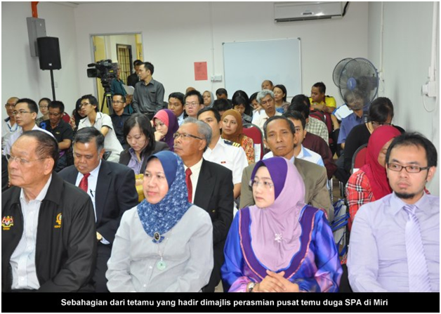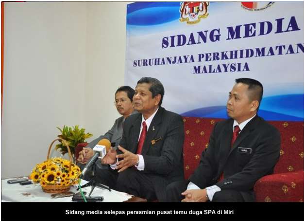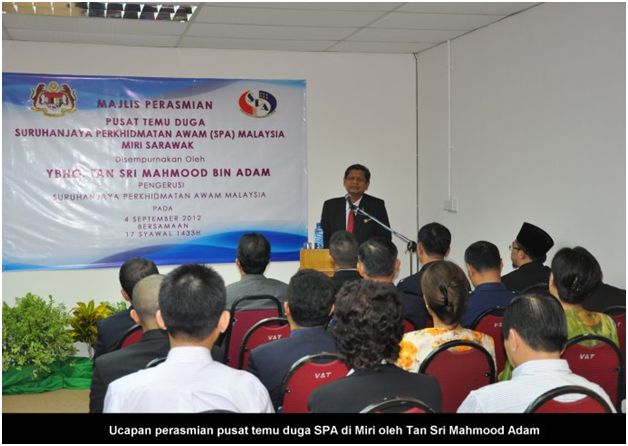 MIRI 4 September------ Suruhanjaya Perkhidmatan Awam (SPA) telah merasmikan Pusat Temu Duga SPA di Miri pada 4 September 2012. Perasmian telah disempurnakan oleh Pengerusi SPA, YBhg. Tan Sri Mahmood Bin Adam. Dalam ucapan perasmian, Pengerusi SPA berkata, pembukaan pusat temu duga ini adalah merupakan kesinambungan kepada usaha SPA untuk memberi kemudahan dan keselesaan kepada calon-calon terutama daripada kalangan anak-anak Negeri Sarawak selari dengan hasrat kerajaan ”Rakyat Didahulukan, Pencapaian Diutamakan”. Hadir sama Setiausaha SPA, YBhg. Dato’ Lamien Bin Sawiyo, Ahli-Ahli Suruhanjaya, pegawai-pegawai kanan SPA serta wakil-wakil jabatan. Sejurus perasmian, satu sesi Sidang Media telah diadakan di tempat yang sama. ------ MediaSPA